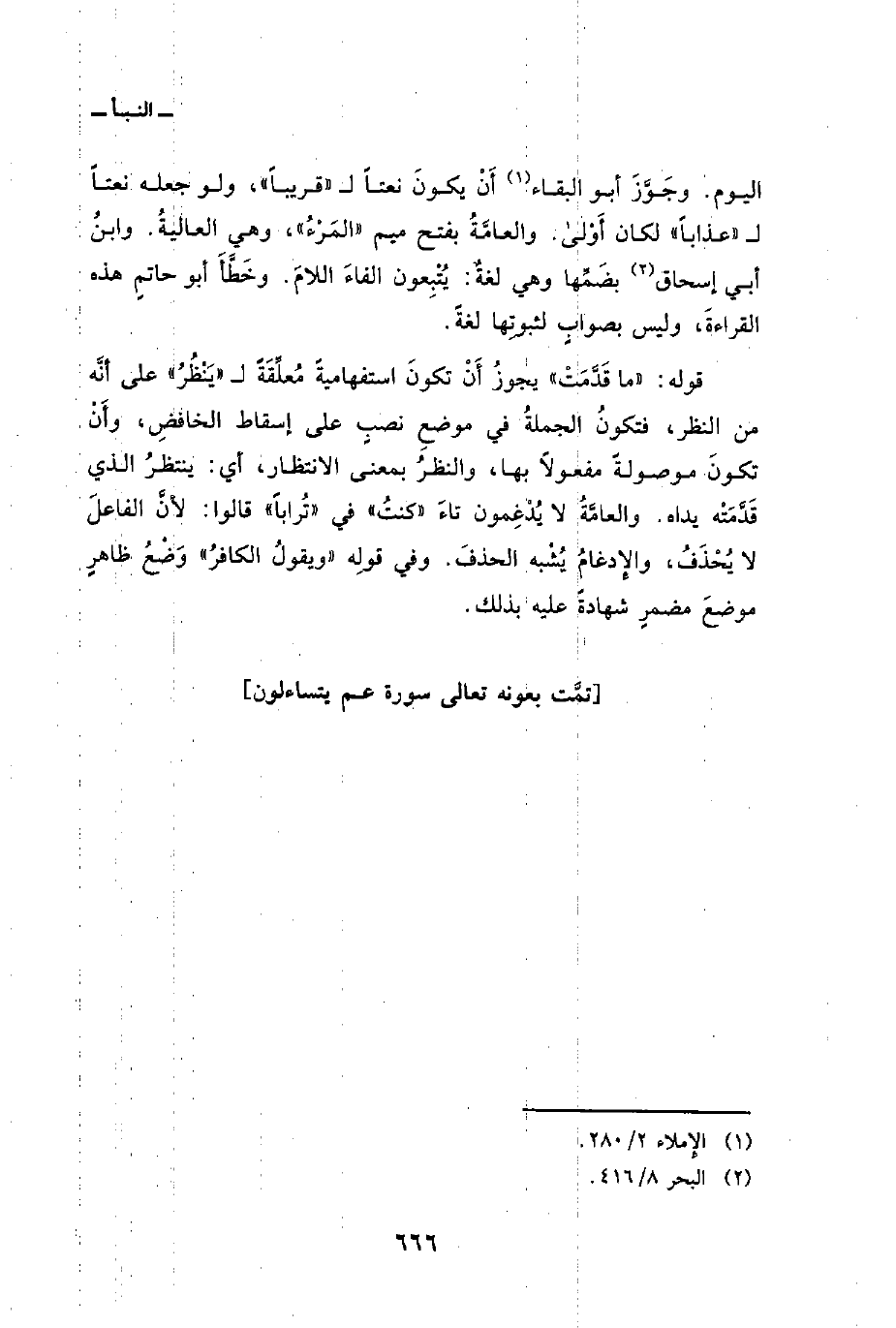 قوله: {مَا قَدَّمَتْ} يجوزُ أَنْ تكونَ استفهاميةً مُعلِّقَةً ل «يَنْظُرُ» على أنَّه من النظر، فتكونُ الجملةُ في موضعِ نصبٍ على إسقاط الخافضِ، وأَنْ تكونَ موصولةً مفعولاً بها، والنظرُ بمعنى الانتظار، أي: ينتظرُ الذي قَدَّمَتْه يداه. والعامَّةُ لا يُدْغِمون تاءَ «كنتُ» في «تُراباً» قالوا: لأنَّ الفاعلَ لا يُحْذَفُ، والإِدغامُ يُشْبه الحذفَ. وفي قولِه «ويقولُ الكافرُ» وَضْعُ ظاهرٍ موضعَ مضمرٍ شهادةً عليه بذلك.