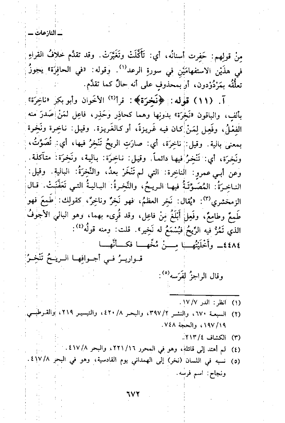 قوله: {نَّخِرَةً} : قرأ الأخَوان وأبو بكر «ناخِرَة» بألفٍ، والباقون «نَخِرَة» بدونِها وهما كحاذِر وحَذِر، فاعِل لمَنْ صَدرَ منه الفِعْلُ، وفَعِل لِمَنْ كان فيه غَريزةً، أو كالغَريزة. وقيل: ناخِرة ونَخِرة بمعنى بالية. وقيل: ناخِرَة، أي: صارَتِ الريحُ تَنْخِرُ فيها، أي: تُصَوِّتُ، ونَخِرَة، أي: تَنْخِرُ فيها دائماً. وقيل: ناخِرَة: بالِية، ونَخِرَة: متآكلة. وعن أبي عمروٍ: الناخِرة: التي لم تَنْخَرْ بعدُ، والنَّخِرَةُ: البالية. وقيل: الناخِرَةُ: المُصَوِّتَةُ فيها الريحُ، والنَّخِرةُ: الباليةُ التي تَعَفَّنَتْ. قال الزمخشري: «يُقال: نَخِر العظمُ، فهو نَخِرٌ وناخِرٌ، كقولِك: طَمِعَ فهو طَمعٌ وطامعٌ، وفَعِل أَبْلَغُ مِنْ فاعِل، وقد قُرِىء بها، وهو البالي الأجوفُ الذي تَمُرُّ فيه الرِّيحُ فيُسْمَعُ له نَخِير» . قلت: ومنه قولُه: