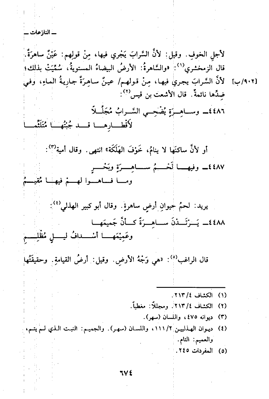 لأجلِ الخوفِ. وقيل: لأنَّ السَّرابَ يَجْري فيها، مِنْ قولِهم: عَيْنٌ ساهرَةٌ. قال الزمخشري: «والسَّاهرةُ: الأرضُ البيضاءُ المستويةُ، سُمِّيَتْ بذلك؛ لأنَّ السَّرابَ يجري فيها، مِنْ قولهم/ عينٌ ساهِرَةٌ جارِيةُ الماء، وفي ضَدِّها نائمةٌ. قال الأشعت بن قيس: