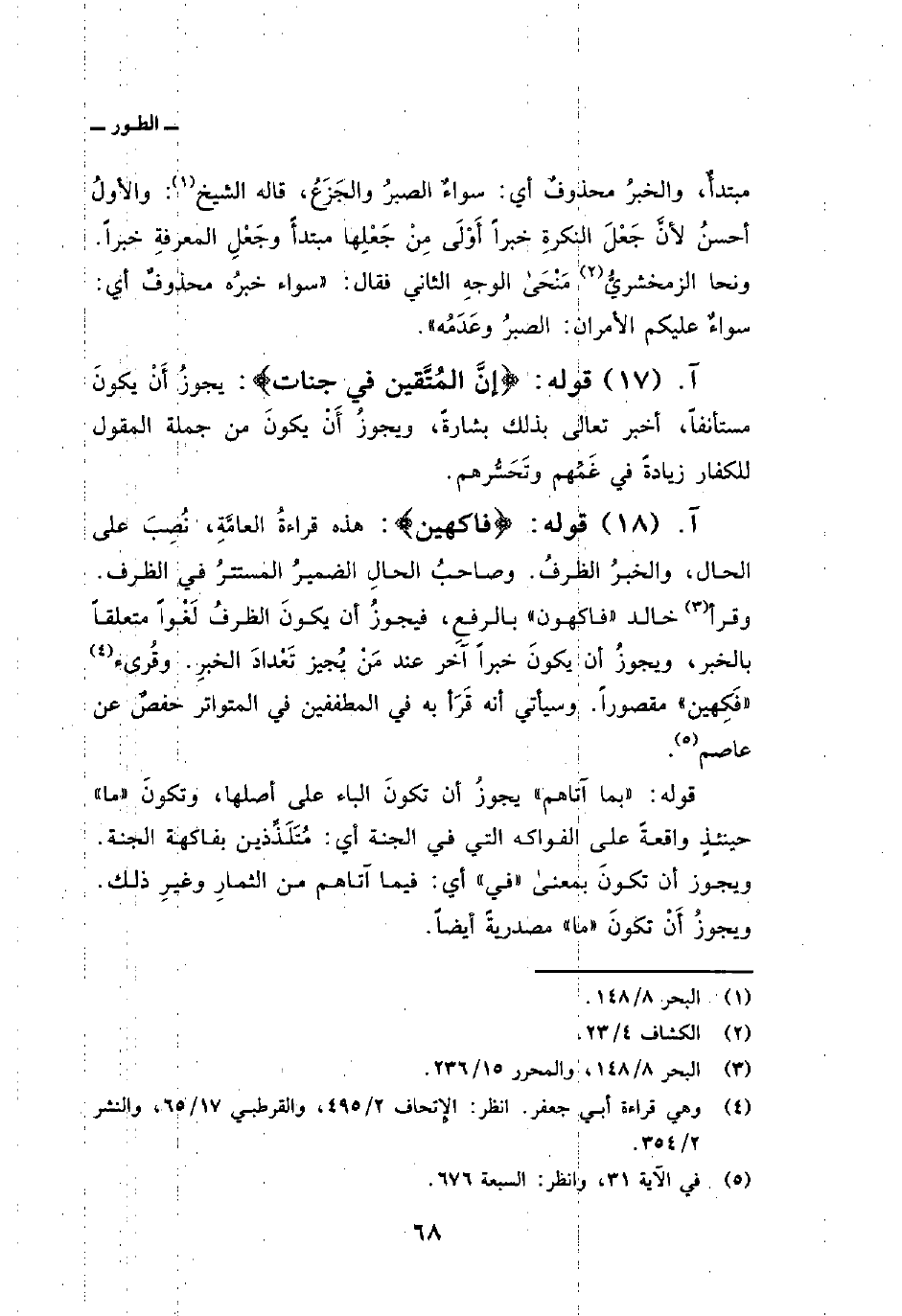 قوله: {فَاكِهِينَ} : هذه قراءةُ العامَّةِ، نُصِبَ على الحال، والخبرُ الظرفُ. وصاحبُ الحالِ الضميرُ المستترُ في الظرف. وقرأ خالد «فاكهون» بالرفع، فيجوزُ أن يكونَ الظرفُ لَغْواً متعلقاً بالخبر، ويجوزُ أن يكونَ خبراً آخر عند مَنْ يُجيز تَعْدادَ الخبرِ. وقُرىء «فَكِهين» مقصوراً. وسيأتي أنه قَرَأ به في المطففين في المتواتر حفصٌ عن عاصم.