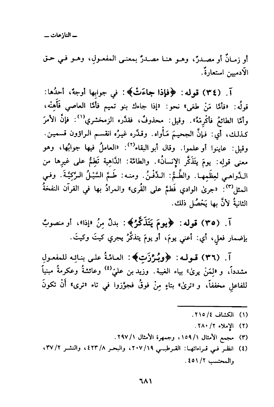 قوله: {فَإِذَا جَآءَتِ} : في جوابِها أوجهٌ، أحدُها: قولُه: «فأمَّا مَنْ طغى» نحو: «إذا جاءك بنو تميم فأمَّا العاصي فَأَهِنْه، وأمَّا الطائعُ فأكْرِمْهُ» . وقيل: محذوفٌ، فقدَّره الزمخشري: فإنَّ الأمرَ كذلك، أي: فإنَّ الجحيمَ مَأْواه. وقدَّره غيرُ انقسم الراؤون قسمين. وقيل: عاينوا أو علموا. وقال أبو البقاء: «العاملُ فيها جوابُها، وهو معنى قولِه:» يومَ يتَذَكَّرَ الإِنسانُ «. والطامَّة: الدَّاهِية تَطِمُّ على غيرِها من الدَّواهي لِعَظَمِها. والطَّمُّ: الدَّفْنُ. ومنه: طَمَّ السَّيْلُ الرَّكِيَّةَ. وفي المثل:» جرى الوادي فَطمَّ على القُرى «والمرادُ بها في القرآن النخفةُ الثانيةُ لأنَّ بها يَحْصُل ذلك.
