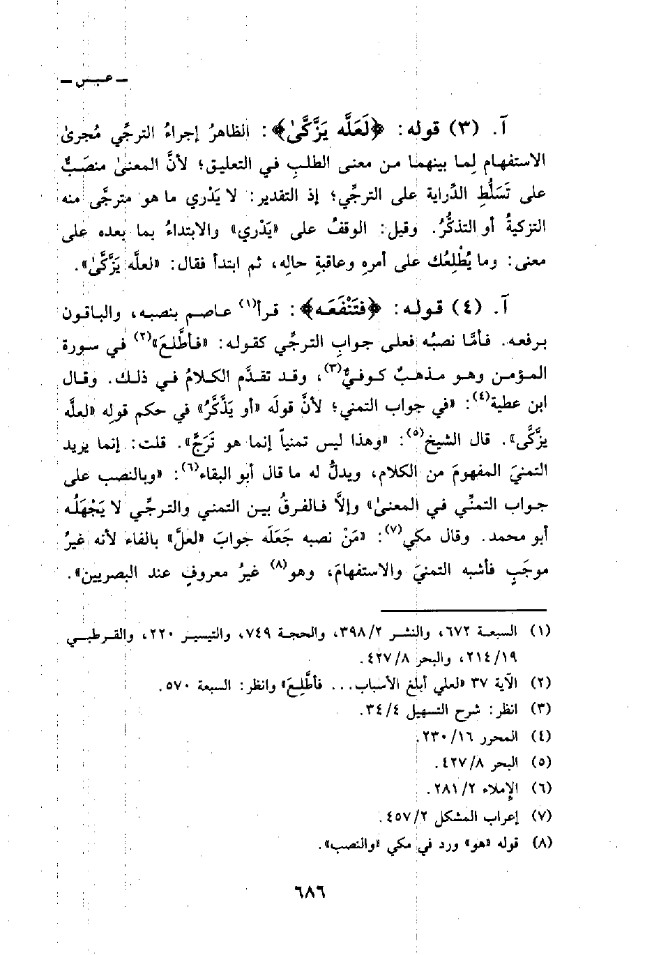 قوله: {فَتَنفَعَهُ} : قرأ عاصم بنصبه، والباقون برفعه. فأمَّا نصبُه فعلى جوابِ الترجِّي كقوله: {فَأَطَّلِعَ} في سورة المؤمن [الآية: 37] وهو مذهبٌ كوفيٌّ، وقد تقدَّم الكلامُ في ذلك. وقال ابن عطية: «في جواب التمني؛ لأنَّ قولَه» أو يَذَّكَّرُ «في حكم قولِه» لعلَّه يزَّكَّى «. قال الشيخ:» وهذا ليس تمنياً إنما هو تَرَجٍّ «. قلت: إنما يريد التمنيَ المفهومَ من الكلام، ويدلُّ له ما قال أبو البقاء:» وبالنصب على جواب التمنِّي في المعنى «وإلاَّ فالفرقُ بين التمني والترجِّي لا يَجْهَلُه أبو محمد. وقال مكي:» مَنْ نصبه جَعَلَه جوابَ «لعلَّ» بالفاء لأنه غيرُ موجَبٍ فأشبه التمنيَ والاستفهامَ، وهو غيرُ معروفٍ عند البصريين «.