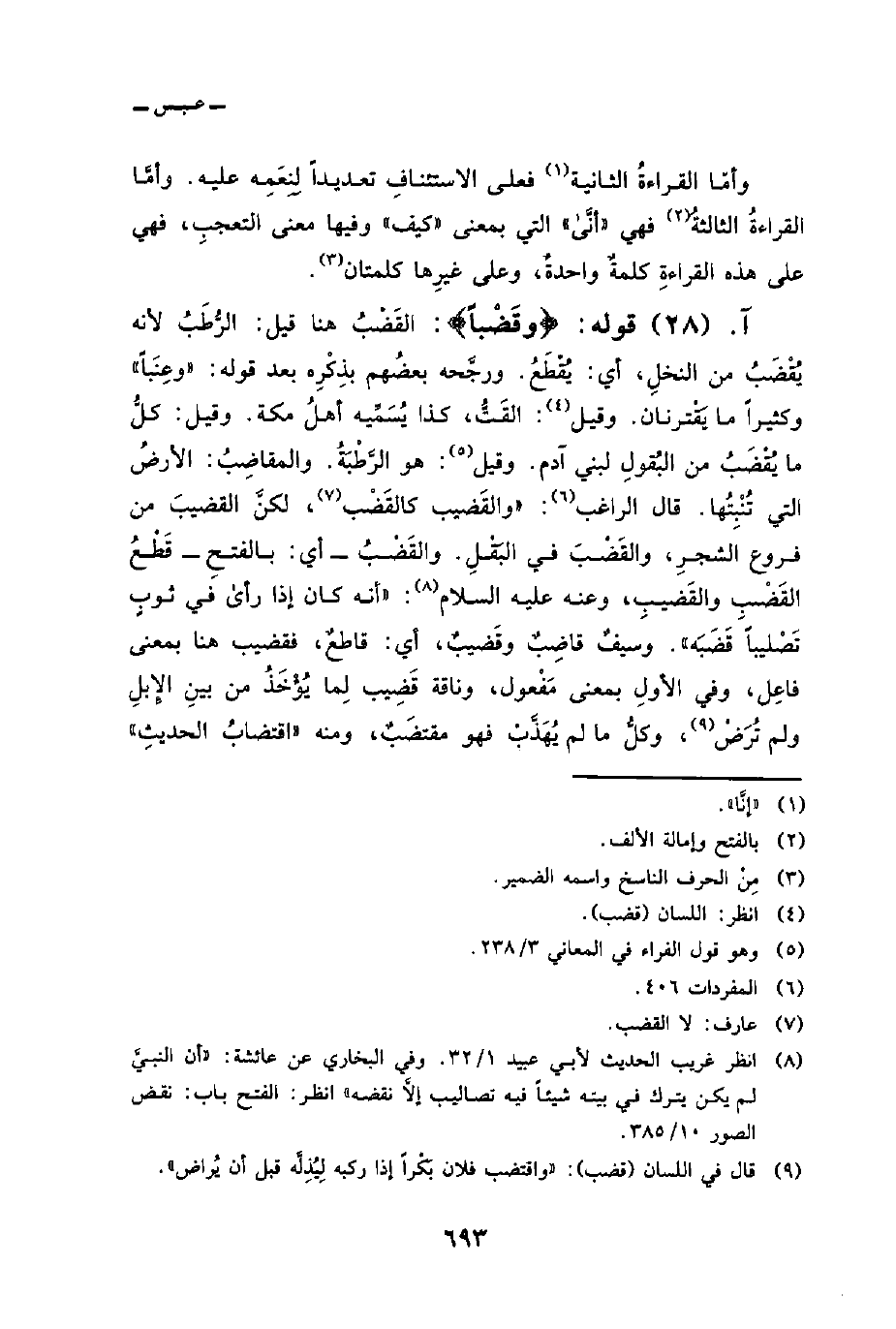 قوله: {وَقَضْباً} : القَضْبُ هنا قيل: الرُّطَبُ لأنه يُقْضَبُ من النخلِ، أي: يُقْطَعُ. ورجَّحه بعضُهم بذِكْرِه بعد قوله: «وعِنَباً» وكثيراً ما يَقْترنان. وقيل: القَتُّ، كذا يُسَمِّيه أهلُ مكة. وقيل: كلُّ ما يُقْضَبُ من البُقولِ لبني آدم. وقيل: هو الرَّطْبَةُ. والمقاضِبُ: الأرضُ التي تُنْبِتُها. قال الراغب: «والقَضيب كالقَضْب، لكنَّ القضيبَ من فروع الشجرِ، والقَضْبَ في البَقْلِ. والقَضْبُ أي: بالفتح قَطْعُ القَضْبِ والقَضيبِ، وعنه عليه السلام:» أنه كان إذا رأى في ثوبٍ تَصْليباً قَضَبَه «وسيفٌ قاضِبٌ وقَضيبٌ، أي: قاطعٌ، فقضيب هنا بمعنى فاعِل، وفي الأولِ بمعنى مَفْعول، وناقة قَضِيب لِما يُؤْخَذُ من بين الإِبلِ ولم تُرَضْ، وكلُّ ما لم يُهَذَّبْ فهو مقتضَبٌ، ومنه» اقتضابُ الحديثِ «