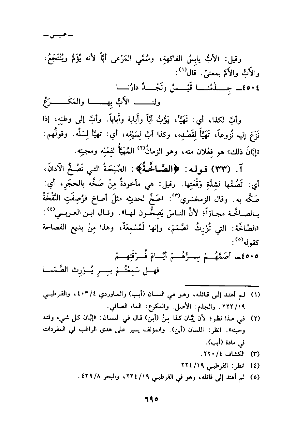 قوله: {الصآخة} : الصَّيحَةُ التي تَصُخُّ الآذانَ، أي: تَصُمُّها لشِدَّةِ وَقْعَتِها. وقيل: هي مأخوذةٌ مِنْ صَخَّه بالحجَرِ، أي: صَكَّه به. وقال الزمخشري: «صَخَّ لحديثِه مثلَ أصاخ فوُصِفَتِ النَّفْخَةُ بالصاخَّة مجازاً؛ لأنَّ الناسَ يَصِخُّون لها» . وقال ابن العربي: «الصَّاخَّة: التي تُوْرِثُ الصَّمَمَ، وإنها لَمُسْمِعَةٌ، وهذا مِنْ بديع الفصاحة كقوله: