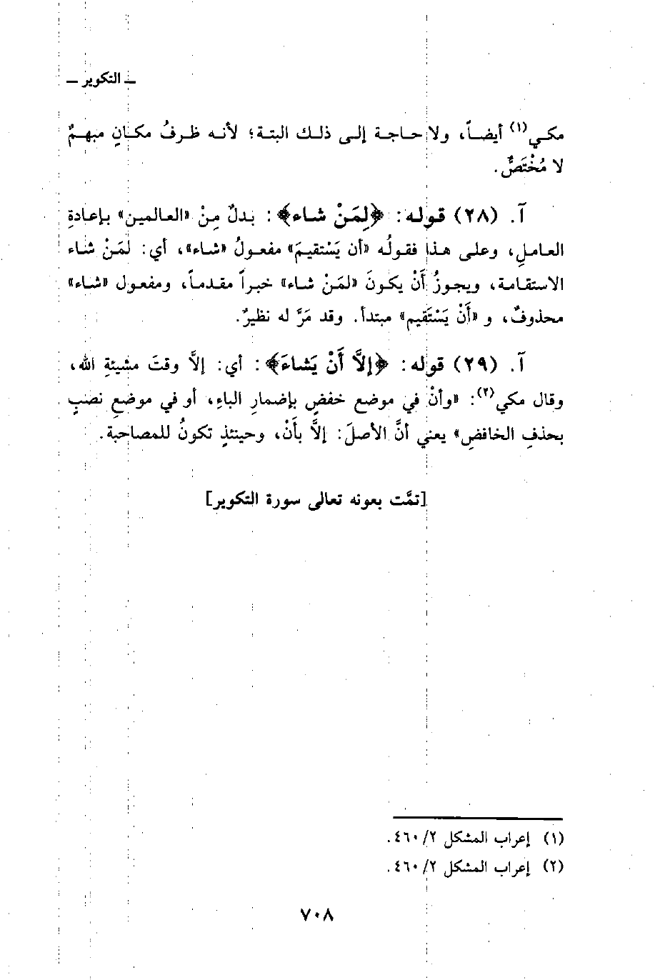 قوله: {لِمَن شَآءَ} : بدلٌ مِنْ «العالمين» بإعادةِ العاملِ، وعلى هذا فقولُه «أن يَسْتقيمَ» مفعولُ «شاء» ، أي: لمَنْ شاء الاستقامة، ويجوزُ أَنْ يكونَ «لمَنْ شاء» خبراً مقدماً، ومفعول «شاء» محذوفٌ، و «أَنْ يَسْتَقيم» مبتدأ. وقد مَرَّ له نظيرٌ.