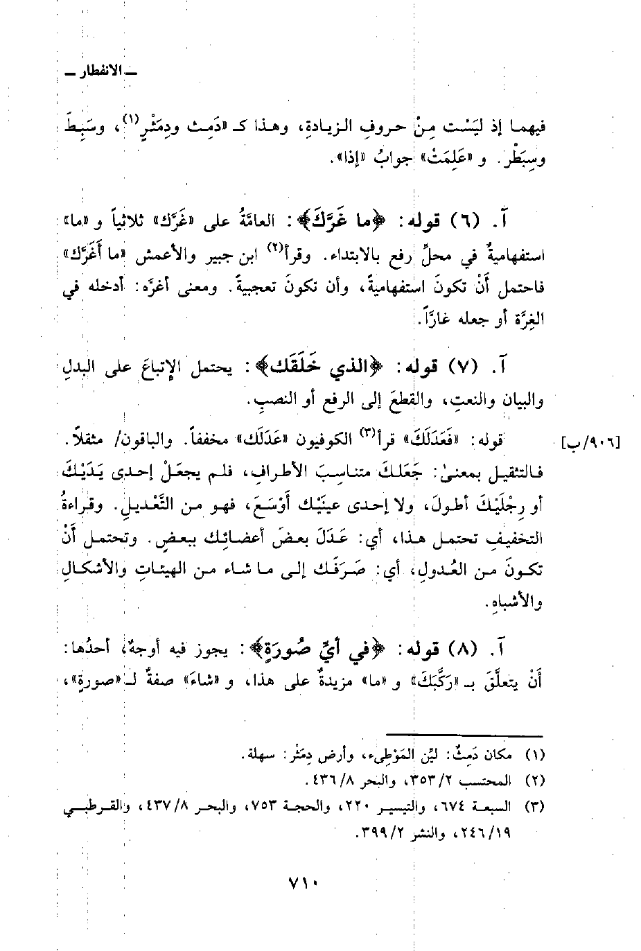 قوله: {فَعَدَلَكَ} قرأ الكوفيون «عَدَلَك، مخففاً. والباقون/ مثقلاً. فالتثقيل بمعنى: جَعَلكَ متناسِبَ الأطرافِ، فلم يجعَلْ إحدى يَدَيْكَ أو رِجْلَيْكَ أطولَ، ولا إحدى عينَيْك أَوْسَعَ، فهو من التَّعْديلِ. وقراءةُ التخفيفِ تحتمل هذا، أي: عَدَلَ بعضَ أعضائِك ببعضٍ. وتحتمل أَنْ تكونَ من العُدولِ، أي: صَرَفَك إلى ما شاء من الهيئاتِ والأشكالِ والأشباهِ.
