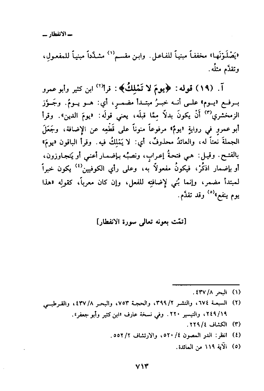 قوله: {يَوْمَ لاَ تَمْلِكُ} : قرأ ابن كثير وأبو عمرو برفع «يوم» على أنه خبرُ مبتدأ مضمرٍ، أي: هو يومُ. وجَوَّز الزمخشري أَنْ يكونَ بدلاً مِمَّا قبلَه، يعني قولَه: «يومَ الدين» . وقرأ أبو عمروٍ في روايةٍ «يومٌ» مرفوعاً منوناً على قَطْعِه عن الإِضافة، وجَعَلَ الجملةَ نعتاً له، والعائدُ محذوفٌ، أي: لا يَمْلِكُ فيه. وقرأ الباقون «يومَ» بالفتح. وقيل: هي فتحةُ إعرابٍ، ونصبُه بإضمار أعني أو يَتجاوزون، أو بإضمار اذكُرْ، فيكونُ مفعولاً به، وعلى رأي الكوفيين يكون خبراً لمبتدأ مضمر، وإنما بُني لإِضافتِه للفعل، وإن كان معرباً، كقولِه {هذا يَوْمُ يَنفَعُ} [المائدة: 119] وقد تقدَّم.