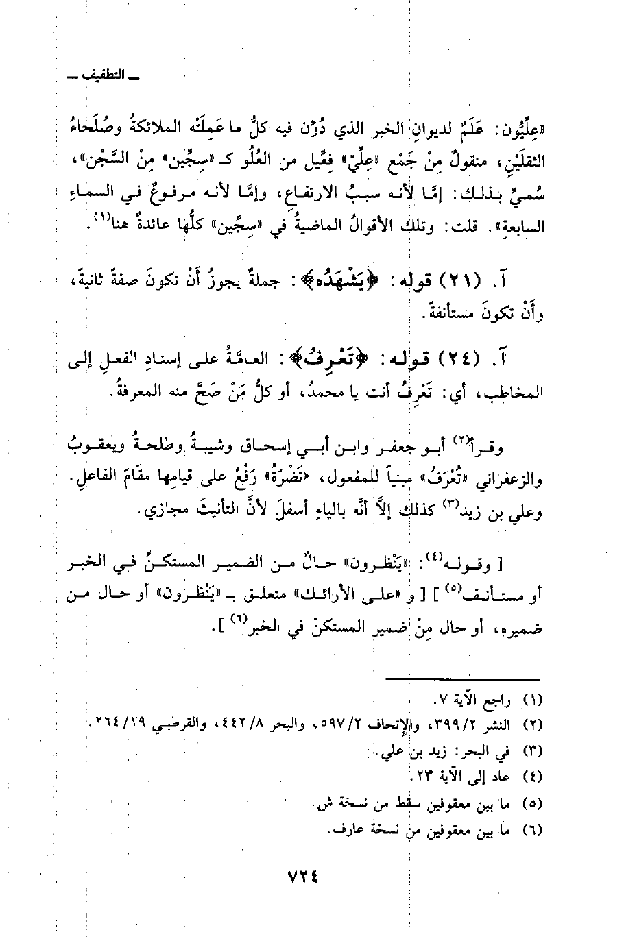 وقرأ أبو جعفر وابن أبي إسحاق وشيبةُ وطلحةُ ويعقوبُ والزعفراني «تُعْرَفُ» مبنياً للمفعول، «نَضْرَةُ» رَفْعٌ على قيامِها مقَامَ الفاعلِ. وعلي بن زيد كذلك إلاَّ أنَّه بالياءِ أسفلَ لأنَّ التأنيثَ مجازي.