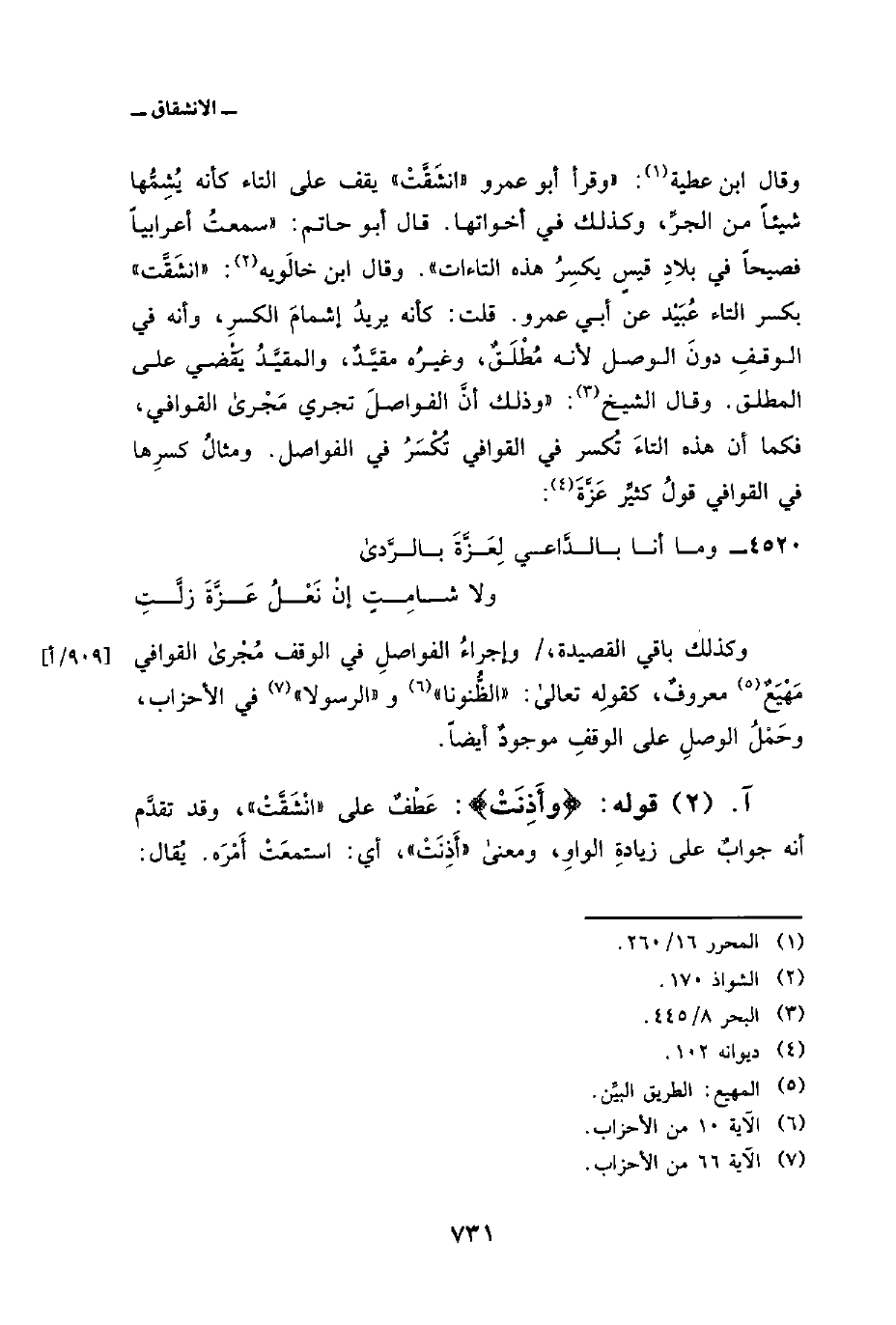 وقال ابن عطية: «وقرأ أبو عمرو» انشَقَّتْ «يقف على التاء كأنه يُشِمُّها شيئاً من الجرِّ، وكذلك في أخواتها. قال أبو حاتم:» سمعتُ أعرابياً فصيحاً في بلادِ قيسٍ يكسِرُ هذه التاءات «. وقال ابن خالَويه:» انشَقَّت «بكسر التاء عُبَيْد عن أبي عمرو. قلت: كأنه يريدُ إشمامَ الكسرِ، وأنه في الوقفِ دونَ الوصل لأنه مُطْلَقٌ، وغيرُه مقيَّدٌ، والمقيَّدُ يَقْضي على المطلق. وقال الشيخ:» وذلك أنَّ الفواصلَ تجري مَجْرى القوافي، فكما أن هذه التاءَ تُكسر في القوافي تُكْسَرُ في الفواصل. ومثالُ كسرِها في القوافي قولُ كثيِّر عَزَّةَ:
