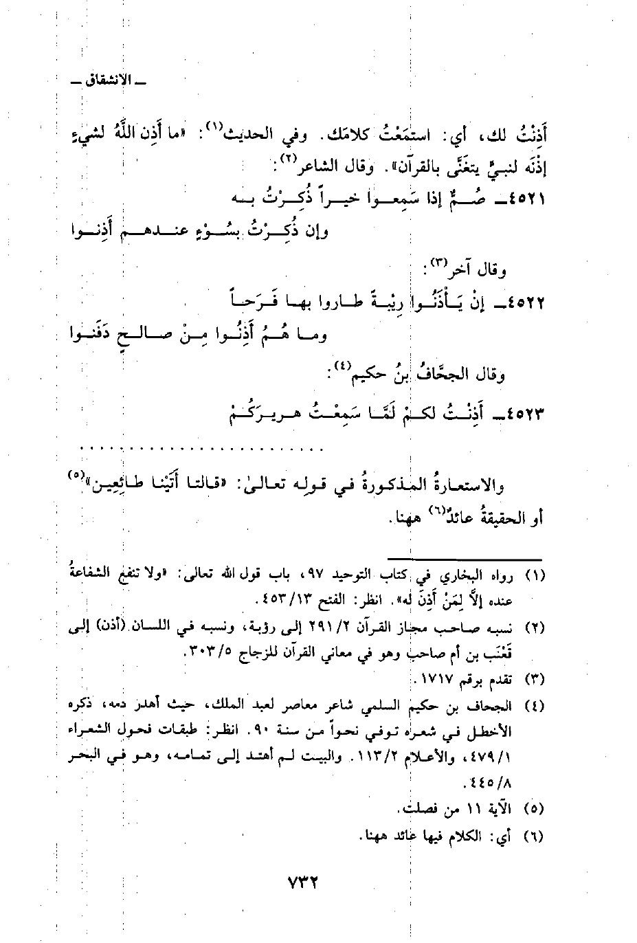 أَذِنْتُ لك، أي: استمَعْتُ كلامَك. وفي الحديث: «ما أَذِن اللَّهُ لشيءٍ إذْنَه لنبيٍّ يتغَنَّى بالقرآن» وقال الشاعر:
