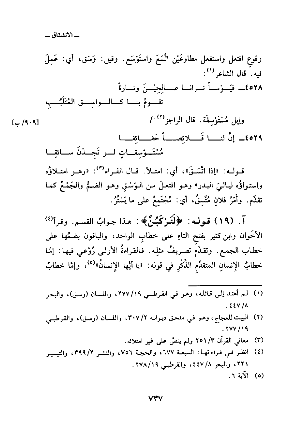قوله: {لَتَرْكَبُنَّ} : هذا جوابُ القسم. وقرأ الأخَوان وابن كثير بفتحِ التاءِ على خطابِ الواحد، والباقون بضمِّها على خطاب الجمع. وتقدَّم تصريفُ مثلِه. فالقراءةُ الأولى رُوْعي فيها: إمَّا خطابُ الإِنسانِ المتقدِّمِ الذِّكْرِ في قوله: {ياأيها الإنسان} [الانشقاق: 6] ، وإمَّا خطابُ