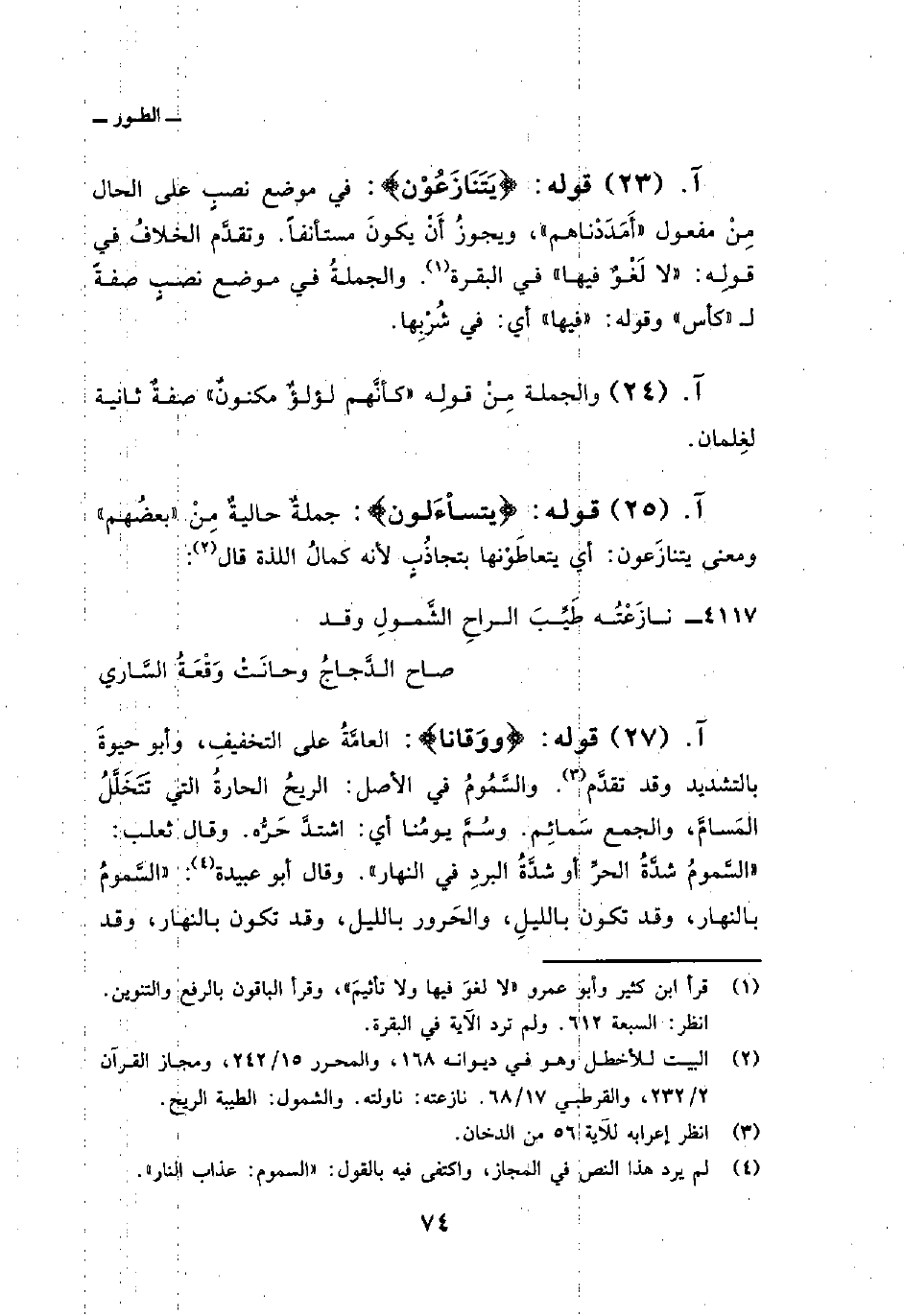 قوله: {يَتَنَازَعُونَ} : في موضع نصبٍ على الحال مِنْ مفعول «أَمَدَدْناهم» ، ويجوزُ أَنْ يكونَ مستأنفاً. وتقدَّم الخلافُ في قولِه: {لاَّ لَغْوٌ فِيهَا} في البقرة. والجملةُ في موضع نصبٍ صفةً ل «كأس» وقوله: «فيها» أي: في شُرْبِها.