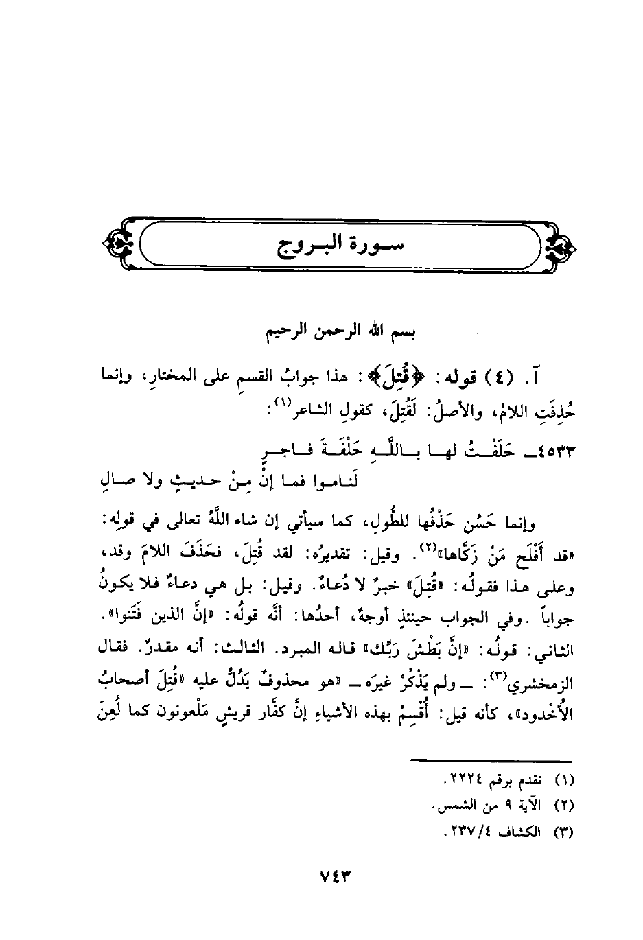 وإنما حَسُن حَذْفُها للطُّولِ، كما سيأتي إن شاء اللَّهُ تعالى في قولِه: {قَدْ أَفْلَحَ مَن زَكَّاهَا} [الشمس: 9] . وقيل: تقديرُه: لقد قُتِلَ، فحَذَفَ اللامَ وقد، وعلى هذا فقولُه: «قُتِلَ» خبرٌ لا دُعاءٌ. وقيل بل هي دعاءٌ فلا يكونُ جواباً. وفي الجواب حينئذٍ أوجهٌ، أحدُها: أنَّه قولُه: {إِنَّ الذين فَتَنُواْ} . الثاني: قولُه: {إِنَّ بَطْشَ رَبِّكَ} قاله المبرد. الثالث: أنه مقدرٌ. فقال الزمخشري: ولم يَذْكُرْ غيرَه «هو محذوفٌ يَدُلُّ عليه {قُتِلَ أَصْحَابُ الأخدود} ، كأنه قيل: أُقْسِمُ بهذه الأشياءِ إنَّ كفَّار قريشٍ مَلْعونون كما لُعِنَ