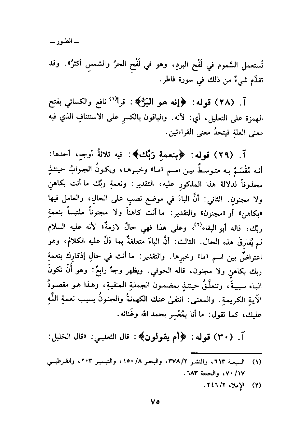 قوله: {بِنِعْمَةِ رَبِّكَ} : فيه ثلاثةُ أوجهٍ، أحدها: أنه مُقْسَمٌ به متوسطٌ بين اسم «ما» وخبرها، ويكونُ الجوابُ حينئذٍ محذوفاً لدلالة هذا المذكورِ عليه، التقدير: ونعمةِ ربِّك ما أنت بكاهنٍ ولا مجنونٍ. الثاني: أنَّ الباءَ في موضع نصبٍ على الحالِ، والعامل فيها «بكاهن» أو «مجنون» والتقدير: ما أنت كاهناً ولا مجنوناً ملتبساً بنعمةِ ربِّك، قاله أبو البقاء، وعلى هذا فهي حالٌ لازمةٌ؛ لأنه عليه السلام لا يُفارِقْ هذه الحال. الثالث: أنَّ الباءَ متعلقةٌ بما دَلَّ عليه الكلامُ، وهو اعتراضٌ بين اسم «ما» وخبرِها. والتقدير: ما أنت في حالِ إذكارِك بنعمةِ ربك بكاهنٍ ولا مجنون، قاله الحوفي. ويظهر وجهٌ رابعٌ: وهو أَنْ تكونَ الباء سببيةً، وتتعلَّقُ حينئذٍ بمضمون الجملةِ المنفيةِ، وهذا هو مقصودُ الآيةِ الكريمةِ. والمعنى: انتفى عنك الكهانةُ والجنونُ بسبب نعمةِ اللَّهِ عليك، كما تقول: ما أنا بمُعْسِر بحمد الله وغَنائه.