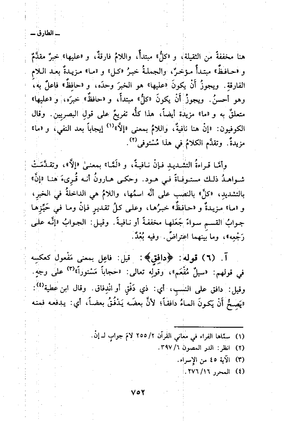 وأمَّا قراءةُ التشديدِ فإنْ نافيةٌ، و» لَمَّا «بمعنى» إلاَّ «، وتقدَّمَتْ شواهدُ ذلك مستوفاةً في هود. وحكى هارونُ أنه قُرِىءَ هنا» إنَّ «بالتشديدِ،» كلَّ «بالنصب على أنَّه اسمُها، واللامُ هي الداخلةُ في الخبرِ، و» ما «مزيدةٌ و» حافظٌ «خبرُها، وعلى كلِّ تقديرِ فإنْ وما في حَيِّزِها جوابُ القسمِ سواءً جَعَلها مخففةً أو نافيةً. وقيل: الجواب {إِنَّهُ على رَجْعِهِ} ، وما بينهما اعتراضٌ. وفيه بُعْدٌ.