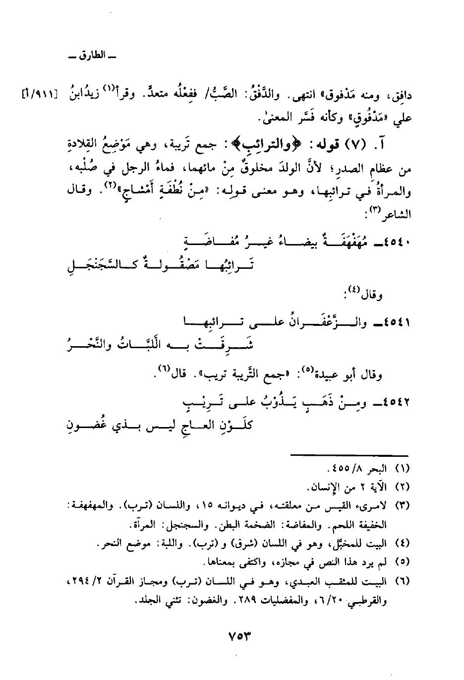 قوله: {والترآئب} : جمع تَريبة. وهي مَوْضِعُ القِلادةِ من عظامِ الصدرِ؛ لأنَّ الولدَ مخلوقٌ مِنْ مائهما، فماءُ الرجل في صُلْبه، والمرأةُ في ترائبِها، وهو معنى قولِه: {مِن نُّطْفَةٍ أَمْشَاجٍ} بالإِنسان: 2] . وقال الشاعر: