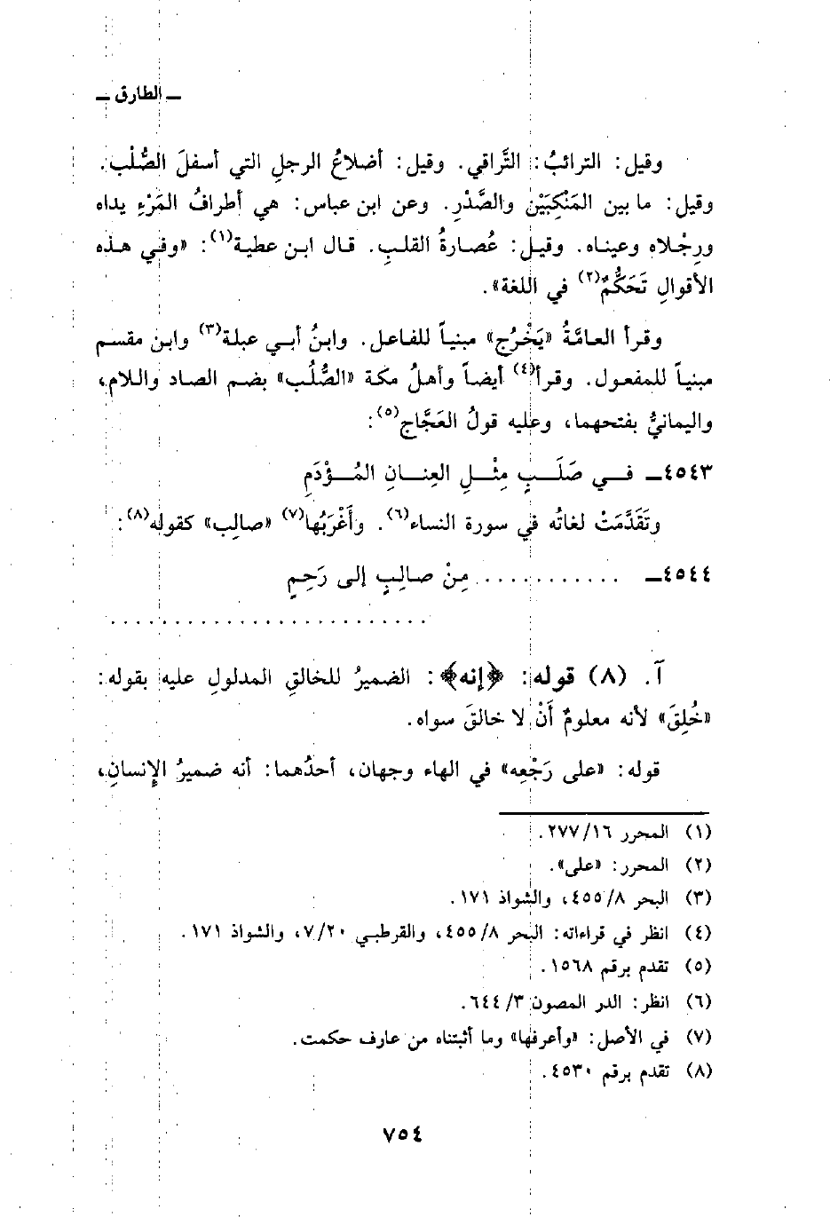 4543 - في صَلَبٍ مِثْلِ العِنانِ المُؤْدَمِ ... وتَقَدَّمَتْ لغاتُه في سورة النساء. وأَغْرَبُها «صالِب» كقوله:
