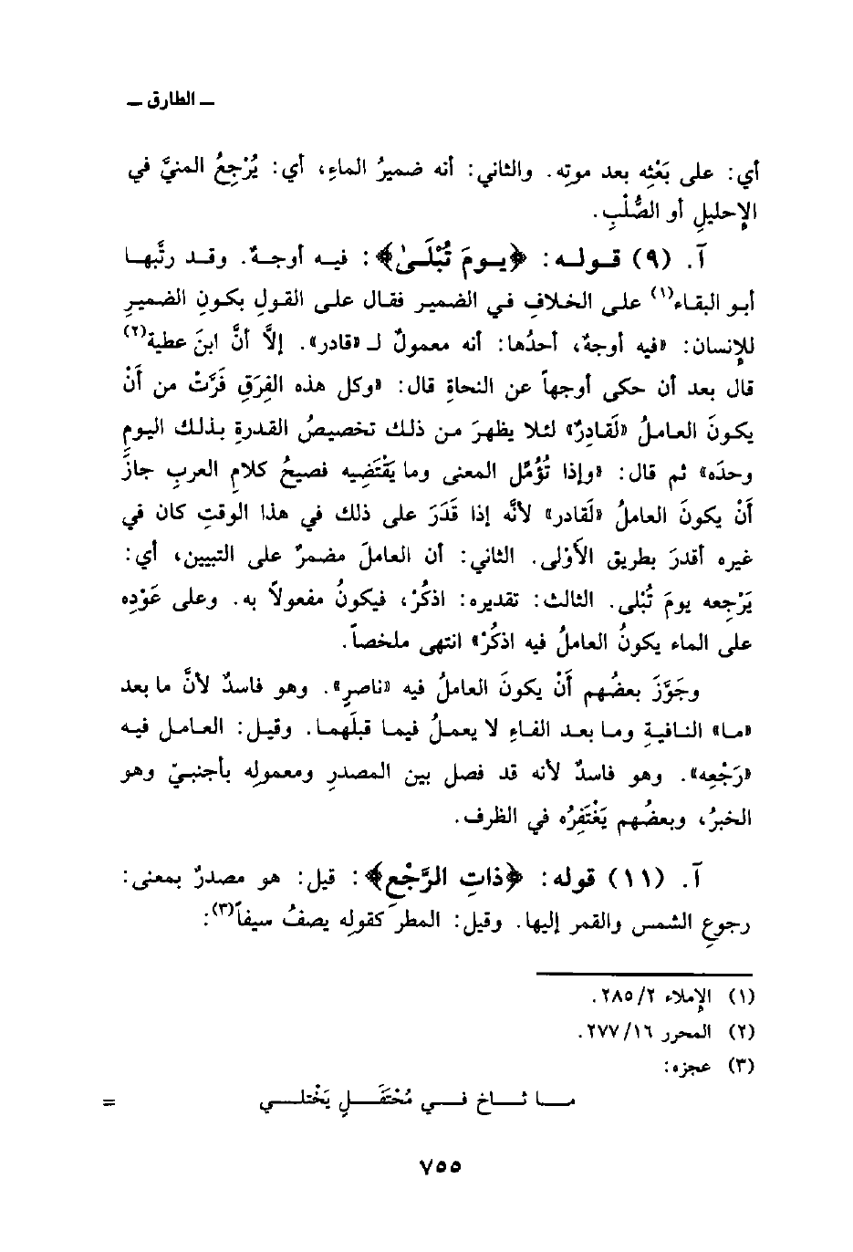 أي: على بَعْثِه بعد موتِه. والثاني: أنه ضميرُ الماءِ، أي: يُرْجِعُ المنيَّ في الإِحليلِ أو الصُّلْبِ.