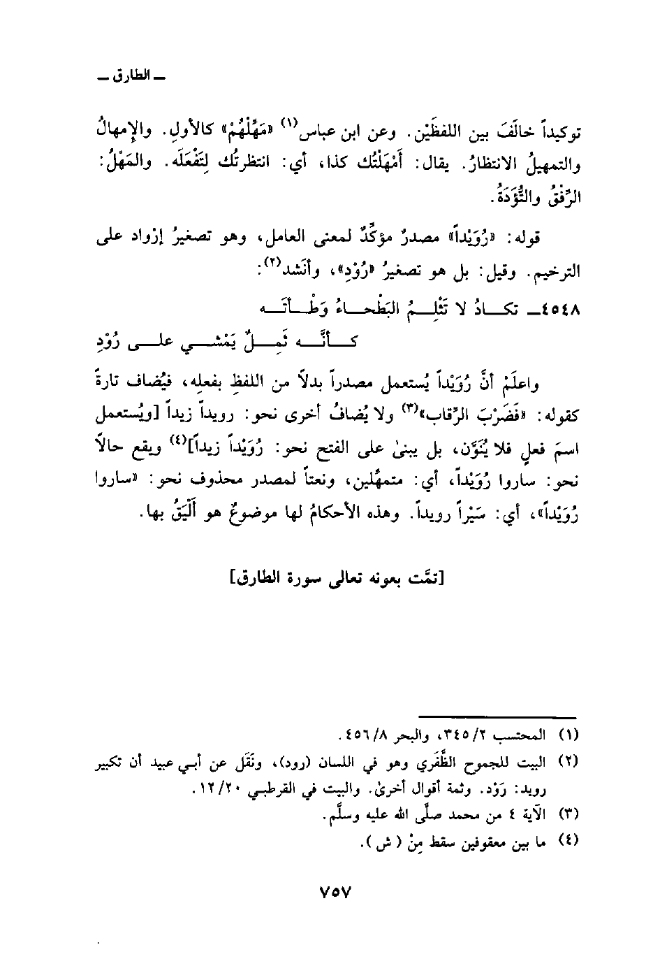 واعلَمْ أنَّ رُوَيْداً يُستعمل مصدراً بدلاً من اللفظِ بفعلِه، فيُضاف تارةً كقوله: {فَضَرْبَ الرقاب} [محمد: 4] ولا يُضافُ أخرى نحو: رويداً زيداً [ويُستعمل اسمَ فعلٍ فلا يُنَوَّن، بل يبنى على الفتح نحو: رُوَيْداً زيداً] ويقع حالاً نحو: ساروا رُوَيْدا، أي: متمهِّلين، ونعتاً لمصدر محذوف نحو: «ساروا رُوَيْداً» ، أي: سَيْراً رويداً. وهذه الأحكامُ لها موضوعٌ هو أَلْيَقُ بها.