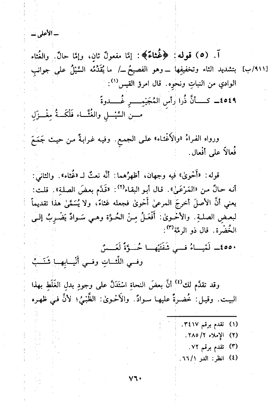 وقد تقدَّم لك أنَّ بعضَ النحاةِ اسْتَدَلَّ على وجودِ بدلِ الغَلَطِ بهذا البيت. وقيل: خُضرةٌ عليها سوادٌ. والأَحْوى: الظَّبْيُ؛ لأنَّ في ظهره