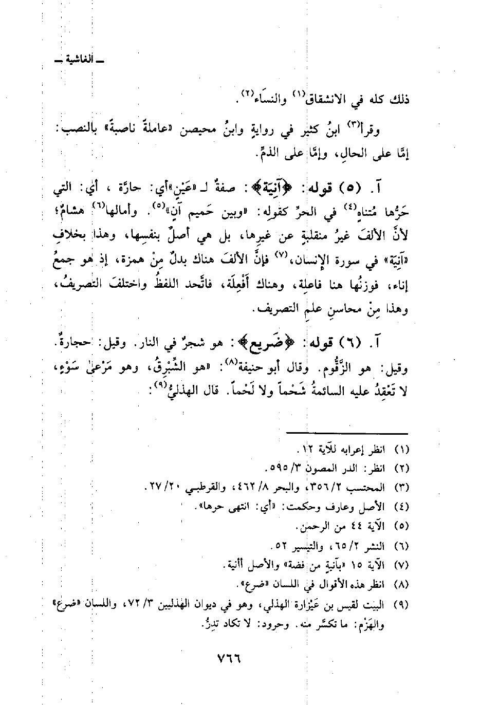 قوله: {آنِيَةٍ} : صفةٌ ل «عَيْنٍ» أي: حارَّة، أي: التي حَرُّها مُتناهٍ في الحرِّ كقولِه: {وَبَيْنَ حَمِيمٍ آنٍ} [الرحمن: 44] . وأمالها هشامٌ؛ لأنَّ الألفَ غيرُ منقلبةٍ عن غيرِها، بل هي أصلٌ بنفسِها، وهذا بخلافِ «آنِيَة» في سورة الإِنسان، فإنَّ الألفَ هناك بدلٌ مِنْ همزة، إذ هو جمعُ إناء، فوزنُها هنا فاعلِة، وهناك أَفْعِلَة، فاتَّحد اللفظُ واختلفَ التصريفُ، وهذا مِنْ محاسنِ علمِ التصريف.