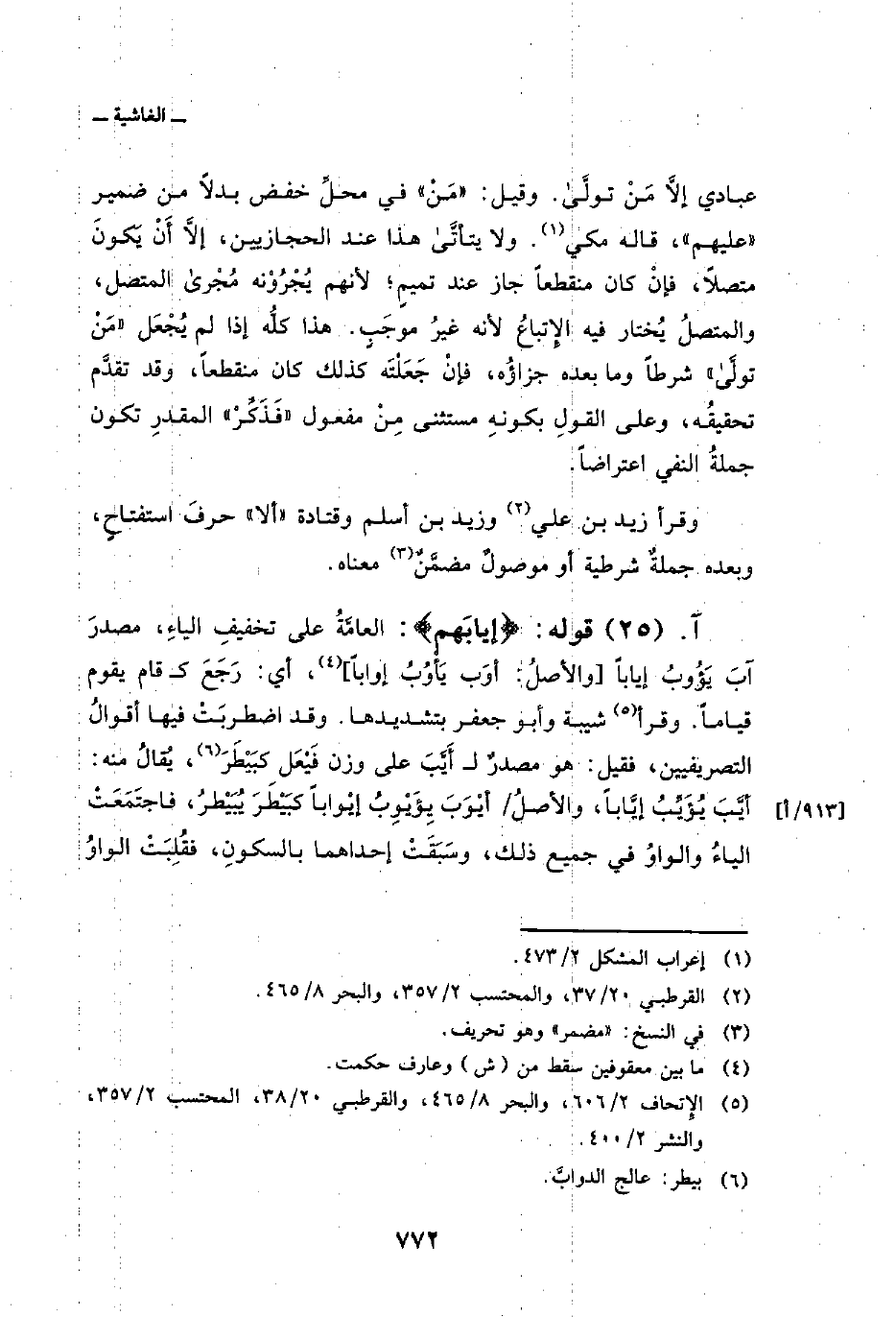قول: {إِيَابَهُمْ} : العامَّةُ على تخفيفِ الياءِ، مصدرِ آبَ يَؤُوبُ إياباً [والأصلُ: أوَب يَأوُبُ إواباً] ، أي: رَجَعَ ك قام يقوم قياماً. وقرأ شيبة وأبو جعفر بتشديدها. وقد اضطربَتْ فيها أقوالُ التصريفيين، فقيل: هو مصدرٌ ل أَيَّبَ على وزن فَيْعَل كبَيْطَرَ، يُقالُ منه: أيَّبَ يُؤَيِّبُ إيَّاباً، والأصلُ/ أيْوَبَ يِؤَيْوِبُ إيْواباً كبَيْطَرَ يُبَيْطرُ، فاجتَمَعَتْ الياءُ والواوُ في جميع ذلك، وسَبَقَتْ إحداهما بالسكونِ، فقُلِبَتْ الواوُ