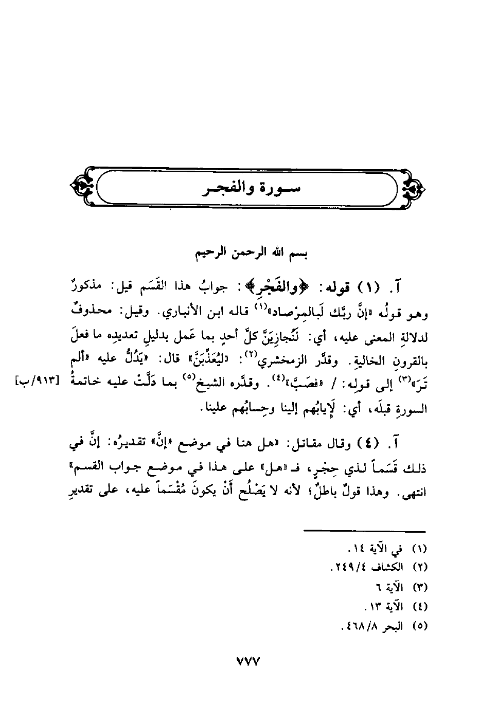 قوله: {والفجر} : جوابُ هذا القَسَم قيل: مذكورٌ وهو قولُه {إِنَّ رَبَّكَ لبالمرصاد} [الفجر: 14] قاله ابن الأنباري. وقيل: محذوفٌ لدلالةِ المعنى عليه، أي: لَنُجازِيَنَّ أحدٍ بما عَمل بدليلِ تعديدِه ما فعلَ بالقرونِ الخاليةِ. وقدَّر الزمخشري: «ليُعَذِّبَنَّ» قال: «يَدُلُّ عليه {أَلَمْ تَرَ} [الآية: 6] إلى قولِه: / {فَصَبَّ} [الفجر: 13] . وقدَّره الشيخ بما دَلَّتْ عليه خاتمةُ السورةِ قبلَه، لإِيابُهم إلينا وحِسابُهم علينا.