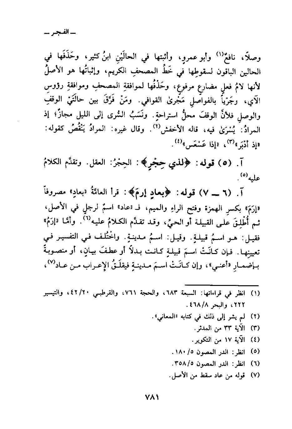 وصلاً، نافعٌ وأبو عمروٍ، وأثبتها في الحالَيْنِ ابنُ كثير، وحَذَفَها في الحالين الباقون لسقوطِها في خَطِّ المصحفِ الكريم، وإثباتُها هو الأصلُ لأنها لامُ فعلٍ مضارعٍ مرفوعٍ، وحَذْفُها لموافقةِ المصحفِ وموافقةِ رؤوسِ الآي، وجَرْياً بالفواصلِ مَجْرى القوافي. ومَنْ فَرَّقَ بين حالَتَيْ الوقفِ والوصلِ فلأنَّ الوقفَ محلُّ استراحةٍ. ونَسَبُ السُّرى إلى الليل مجازٌ؛ إذ المرادُ: يُسْرَى فيه، قاله الأخفش. وقال غيره: المرادُ يَنْقُصُ كقوله: {إِذْ أَدْبَرَ} [المدثر: 33] ، {إِذَا عَسْعَسَ} [التكوير: 17] .