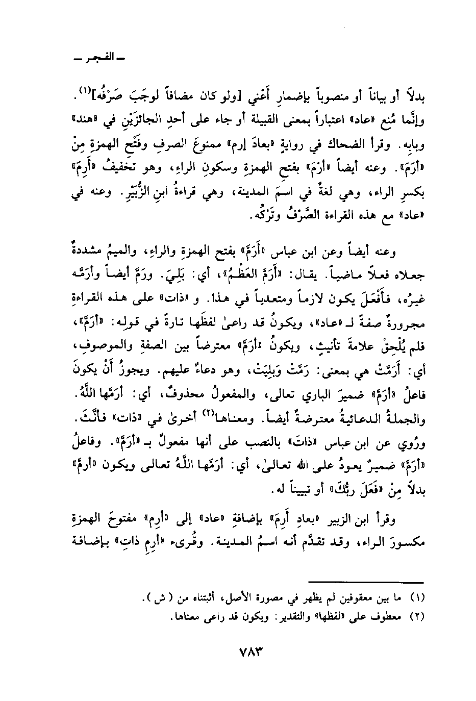 بدلاً أو بياناً أو منصوباً بإضمارِ أَعْني [ولو كان مضافاً لوجَبَ صَرْفُه] . وإنَّما مُنع «عاد» اعتباراً بمعنى القبيلة أو جاء على أحدِ الجائزَيْنِ في «هند» وبابِه. وقرأ الضحاك في روايةٍ «بعادَ إرم» ممنوعَ الصرفِ وفَتْحِ الهمزةِ مِنْ «أرَمَ» . وعنه أيضاً «أرْمَ» بفتحِ الهمزةِ وسكونِ الراءِ، وهو تخفيفُ «أَرِمَ» بكسرِ الراء، وهي لغةٌ في اسمَ المدينة، وهي قراءةُ ابنِ الزُّبَيْرِ. وعنه في «عاد» مع هذه القراءة الصَّرْفُ وتَرْكُه.
