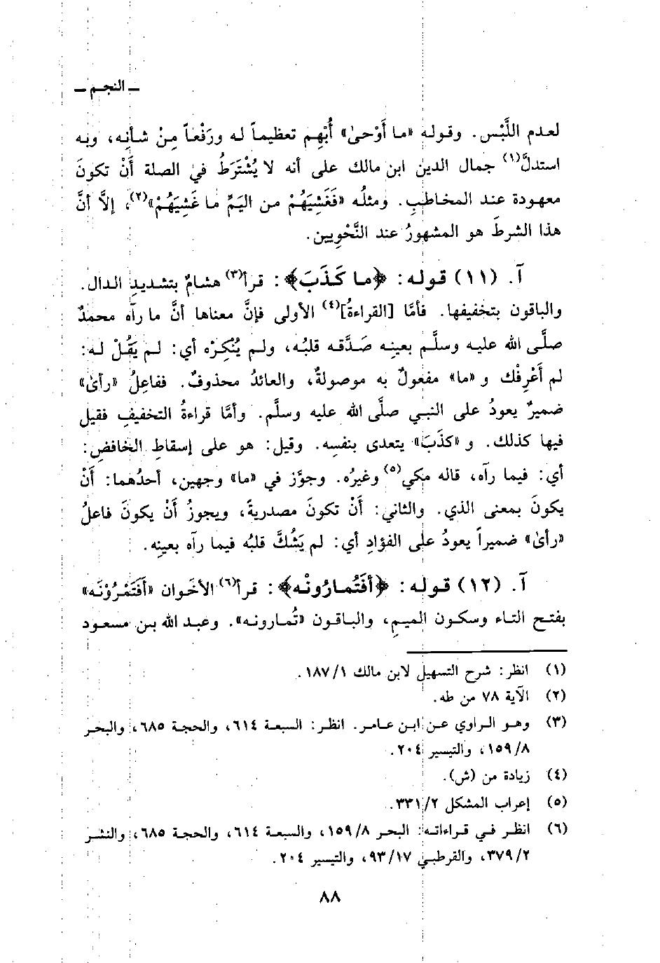 قوله: {مَا كَذَبَ} : قرأ هشامٌ بتشديدِ الدال. والباقون بتخفيفها. فأمَّا [القراءةُ] الأولى فإنَّ معناها أنَّ ما رآه محمدٌ صلَّى الله عليه وسلَّم بعينِه صَدَّقه قلبُه، ولم يُنْكِرْه أي: لم يَقُلْ له: لم أَعْرِفْك و «ما» مفعولٌ به موصولةٌ، والعائدُ محذوفٌ. ففاعِلُ «رأى» ضميرٌ يعودُ على النبي صلَّى الله عليه وسلَّم. وأمَّا قراءةُ التخفيفِ فقيل فيها كذلك. و «كذَبَ» يتعدى بنفسِه. وقيل: هو على إسقاطِ الخافضِ: أي: فيما رآه، قاله مكي وغيرُه. وجوَّز في «ما» وجهين، أحدُهما: أَنْ يكونَ بمعنى الذي. والثاني: أَنْ تكونَ مصدريةً، ويجوزُ أَنْ يكونَ فاعلُ «رأى» ضميراً يعودُ على الفؤادِ أي: لم يَشُكَّ قلبُه فيما رآه بعينِه.