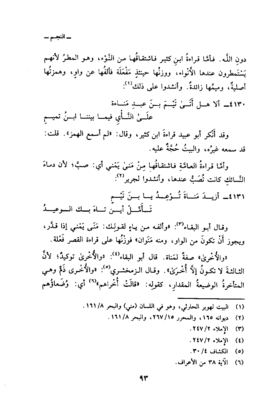 دونِ اللَّه. فأمَّا قراءةُ ابنِ كثير فاشتقاقُها من النَّوْء، وهو المطرُ لأنهم يَسْتَمطرون عندها الأَنْواء، ووزنُها حينئذٍ مَفْعَلَة فألفُها عن واوٍ، وهمزتُها أصليةٌ، وميمُها زائدةٌ. وأنشدوا على ذلك: