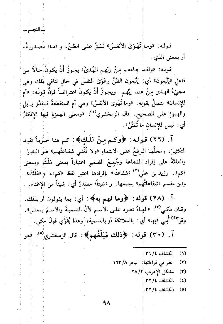 قوله: {وَكَمْ مِّن مَّلَكٍ} : كم هنا خبريةٌ تفيد التكثيرَ، ومحلُّها الرفعُ على الابتداءِ «ولا تُغْني شفاعتُهم» هو الخبرُ. والعامَّةُ على إفراد الشفاعة وجُمِعَ الضميرِ اعتباراً بمعنى مَلَكَ وبمعنى «كم» . وزيد بن علي «شفاعتُه» بإفرادها اعتبر لفظ «كم» ، و «مَلَكَ» . وابن مقسم «شفاعاتُهم» بجمعها. و «شيئاً» مصدرٌ أي: شيئاً من الإِغناء.