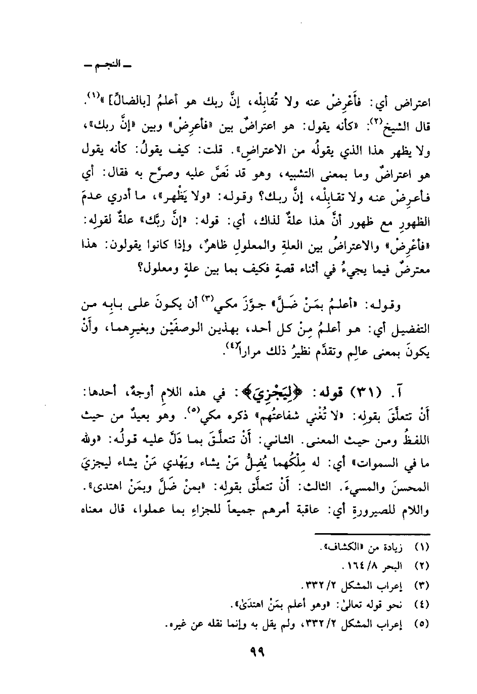اعتراض أي: فأَعْرِضْ عنه ولا تُقابِلْه، إنَّ ربك هو أعلمُ [بالضالِّ] » . قال الشيخ: «كأنه يقول: هو اعتراضٌ بين» فأعرِضْ «وبين» إنَّ ربك «، ولا يظهر هذا الذي يقولُه من الاعتراضِ» . قلت: كيف يقولُ: كأنه يقول هو اعتراضٌ وما بمعنى التشبيه، وهو قد نَصَّ عليه وصرَّح به فقال: أي فأعرِضْ عنه ولا تقابِلْه، إنَّ ربك؟ وقوله: «ولا يَظْهر» ، ما أدري عدمَ الظهورِ مع ظهور أنَّ هذا علةٌ لذاك، أي: قوله: «إنَّ ربَّك» علةٌ لقولِه: «فأعْرِضْ» والاعتراضُ بين العلةِ والمعلولِ ظاهرٌ، وإذا كانوا يقولون: هذا معترضٌ فيما يجيءُ في أثناء قصةٍ فكيف بما بين علةٍ ومعلول؟