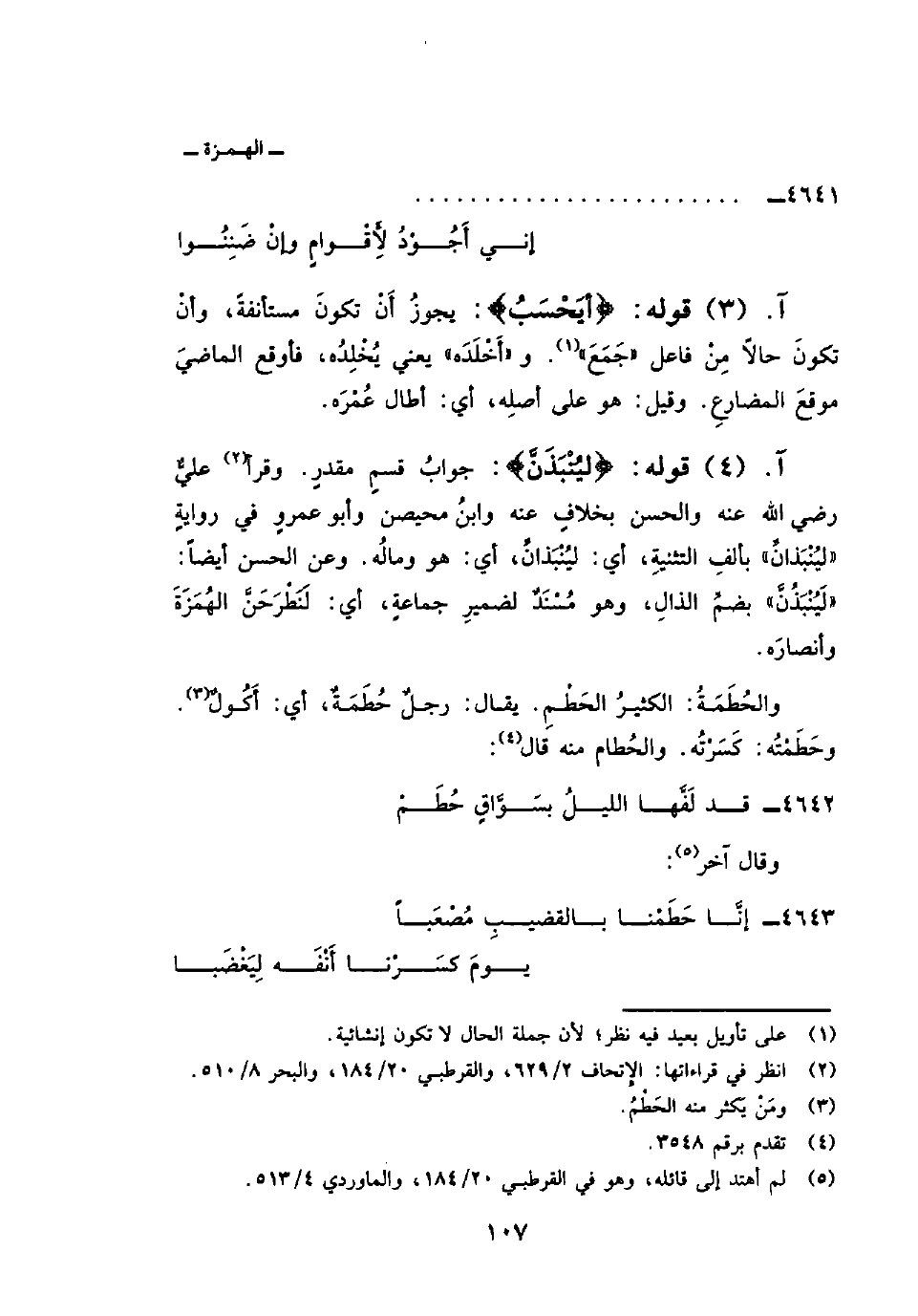 قوله: {لَيُنبَذَنَّ} : جوابُ قسمٍ مقدرٍ. وقرأ عليُّ رضي الله عنه والحسن بخلافٍ عنه وابنُ محيصن وأبو عمروٍ في روايةٍ «ليُنْبَذانِّ» بألفِ التثنيةِ، أي: ليُنْبَذانِّ، أي: هو ومالُه. وعن الحسن أيضاً: «لَيُنْبَذُنَّ» بضمِّ الذالِ، وهو مُسْنَدٌ لضميرِ جماعةٍ، أي: لنَطْرَحَنَّ الهُمَزَةَ وأنصارَه.