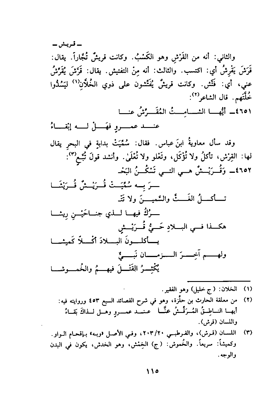 والثاني: أنه من القَرْشِ وهو الكَسْبُ. وكانت قريشٌ تُجَّاراً. يقال: قَرَشَ يَقْرِشُ أي: اكتسب. والثالث: أنه مِنْ التفتيش. يقال قَرَّشَ يُقَرِّشُ عني، أي: فَتَّش. وكانت قريشٌ يُفَتِّشون على ذوي الخُلاَّنِ ليَسُدُّوا خُلَّتَهم. قال الشاعر: