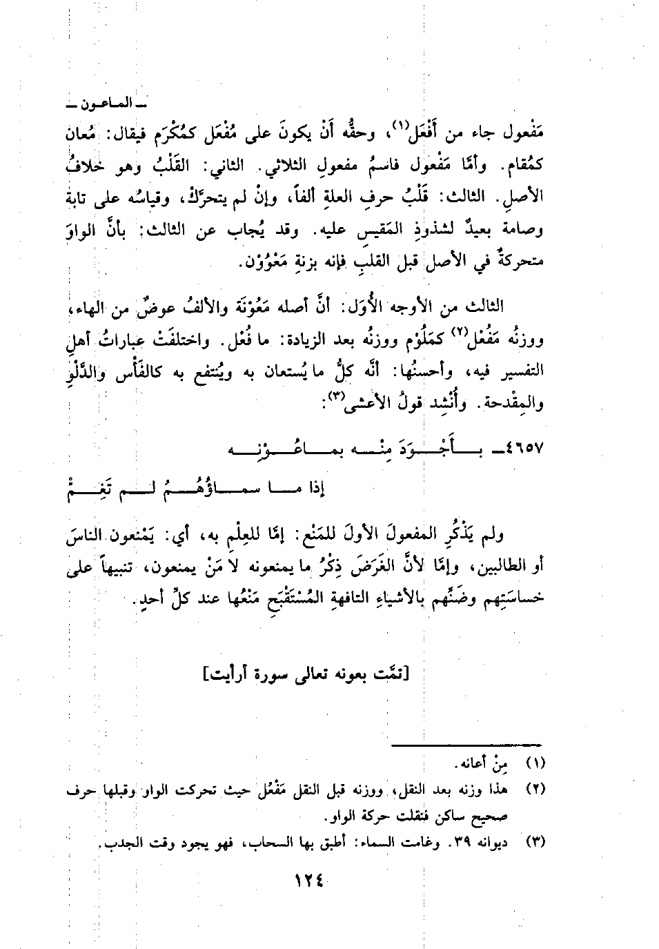 الثالث: من الأوجه الأُوَل: أنَّ أصله مَعُوْنَة والألفُ عوضٌ من الهاء، ووزنُه مَفُعْل كمَلُوْم ووزنُه بعد الزيادة: ما فُعْل. واختلفَتْ عباراتُ أهلِ التفسير فيه، وأحسنُها: أنَّه كلُّ ما يُستعان به ويُنتفع به كالفَأْس والدَّلْوِ والمِقْدحة وأُنْشِد قولُ الأعشى:
