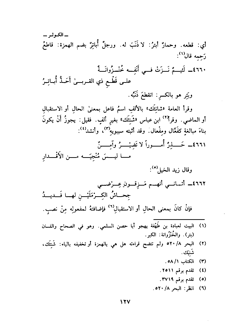 وقرأ العامة «شانِئَك» بالألفِ اسمُ فاعل بمعنى الحالِ أو الاستقبالِ أو الماضي. وقرأ ابن عباس «شَنِئَك» بغيرِ ألفٍ. فقيل: يجوزُ أَنْ يكونَ بناءَ مبالغةٍ كفَعَّال ومِفْعال. وقد أثبته سيبويهِ، وأنشد: