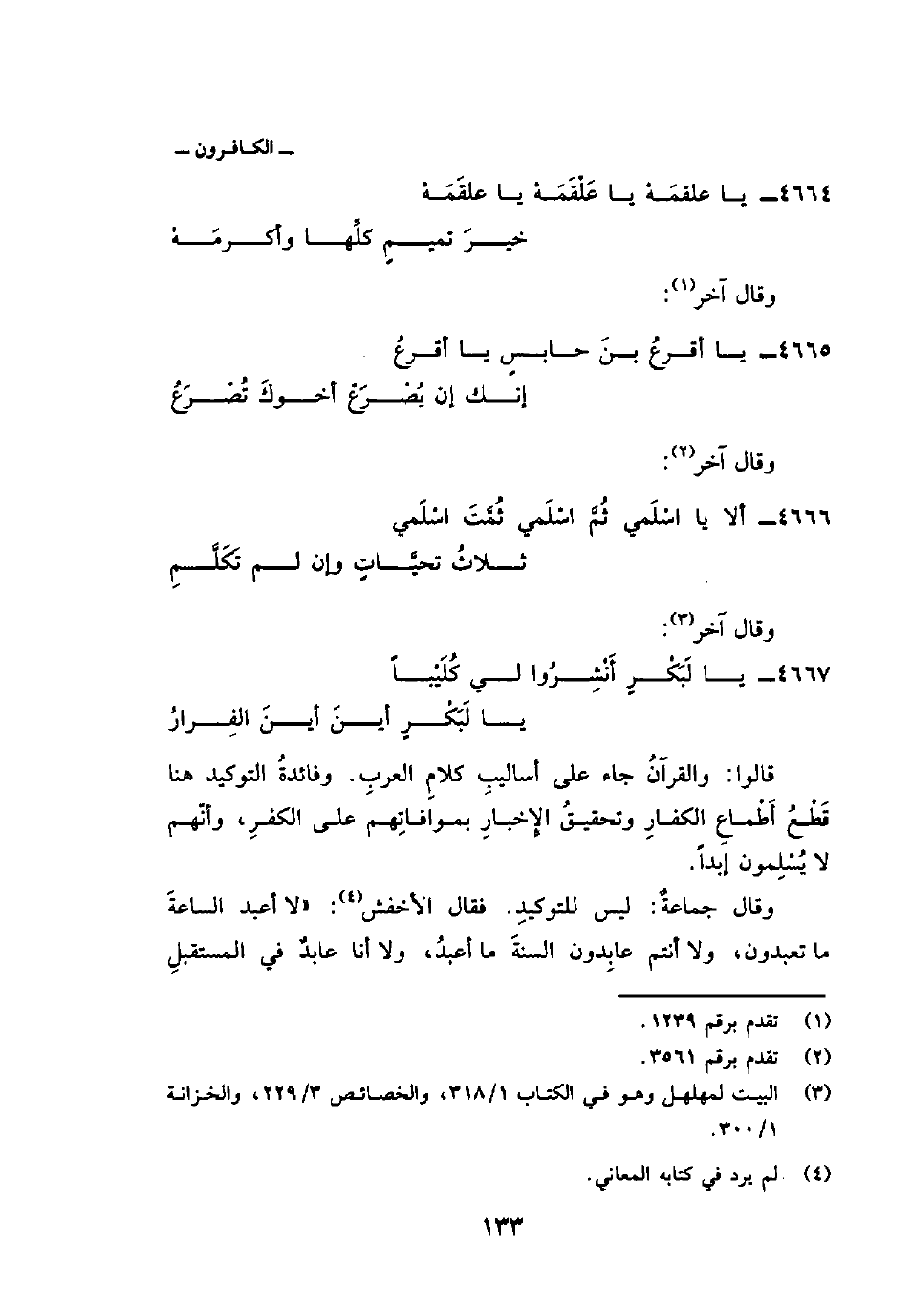 قالوا: والقرآنُ جاء على أساليبِ كلامِ العربِ. وفائدةُ التوكيد هنا قَطْعُ أَطْماعِ الكفارِ وتحقيقُ الإِخبارِ بموافاتِهم على الكفرِ، وأنّهم لا يُسْلِمون إبداً.
