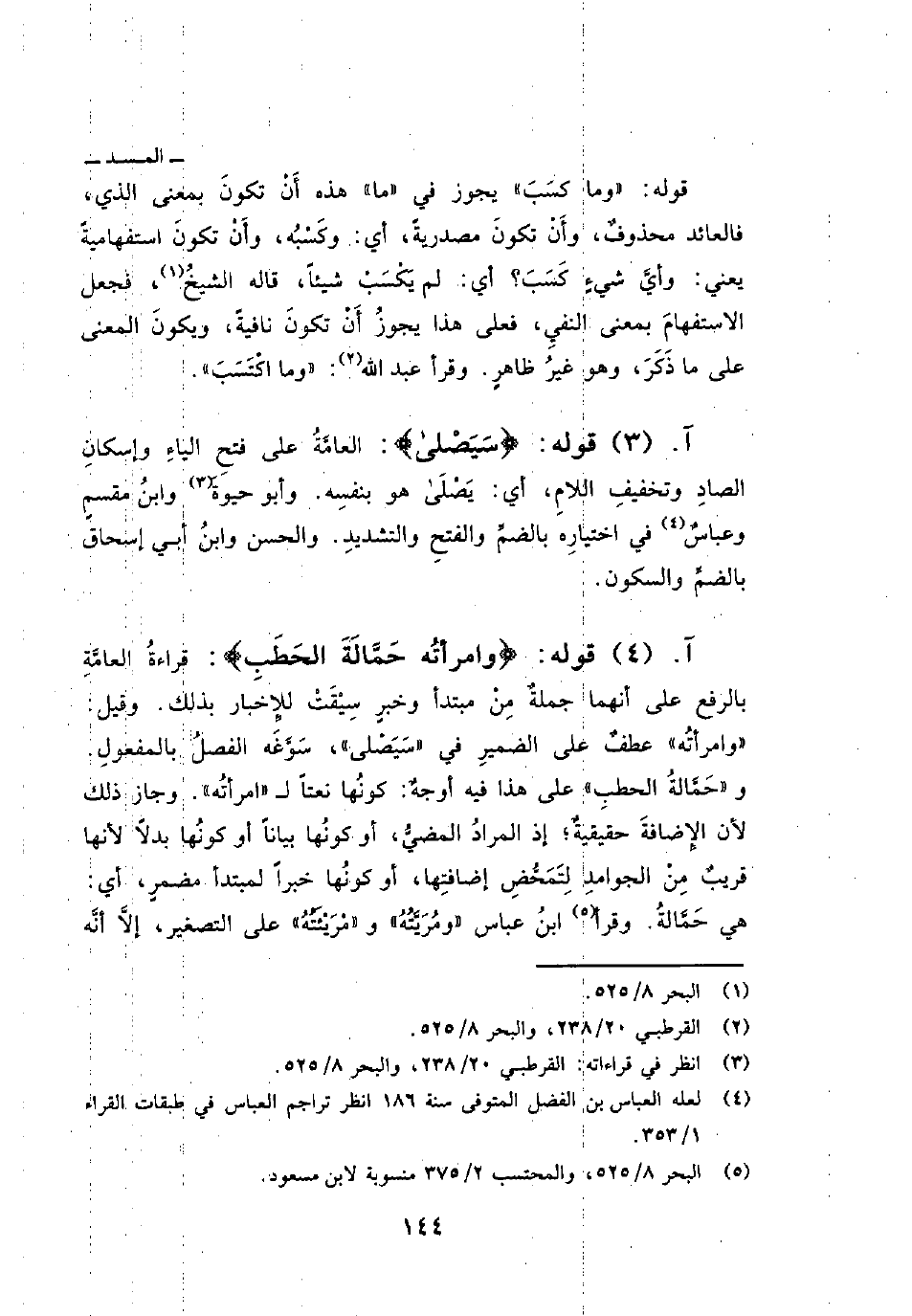 قوله: {وَمَا كَسَبَ} يجوز في «ما» هذه أَنْ تكونَ بمعنى الذي، فالعائد محذوفٌ، وأَنْ تكونَ مصدريةً، أي: وكَسْبُه، وأَنْ تكونَ استفهاميةً يعني: وأيَّ شيءٍ كَسَبَ؟ أي: لم يَكْسَبْ شيئاً، قاله الشيخُ، فجعل الاستفهامَ بمعنى النفيِ، فعلى هذا يجوزُ أَنْ تكونَ نافيةً، ويكونَ المعنى على ما ذَكَرَ، وهو غيرُ ظاهرٍ وقرأ عبد الله: «وما اكْتَسَبَ» .
