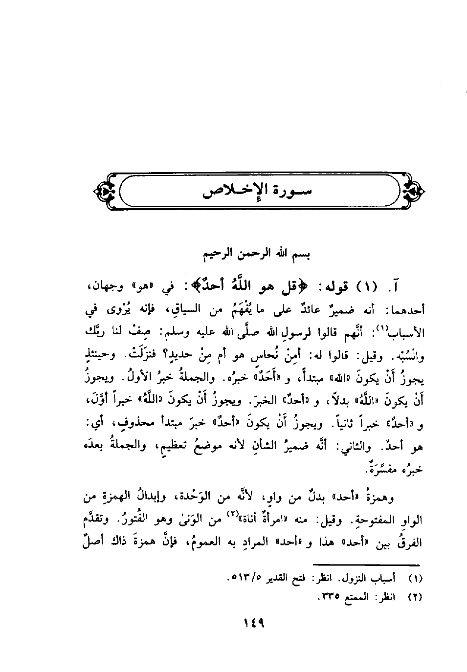 قوله: {قُلْ هُوَ الله أَحَدٌ} : في «هو» وجهان، أحدهما: أنه ضميرٌ عائدٌ على ما يفْهَمُ من السياقِ، فإنه يُرْوى في الأسباب: أنَّهم قالوا لرسولِ الله صلَّى الله عليه وسلم: صِفْ لنا ربَّك وانْسُبْه. وقيل: قالوا له: أمِنْ نُحاس هو أم مِنْ حديدٍ؟ فنَزَلَتْ. وحينئذٍ يجوزُ أَنْ يكونَ «الله» مبتدأً، و «أَحَدٌ» خبرُه. والجملةُ خبرُ الأولُ. ويجوزُ أَنْ يكونَ «اللَّهُ» بدلاً، و «أحدٌ» الخبرَ. ويجوزُ أَنْ يكونَ «اللَّهُ» خبراً أوَّلَ، و «أحدٌ» خبراً ثانياً. ويجوزُ أَنْ يكونَ «أحدٌ» خبرَ مبتدأ محذوفٍ، أي: هو أحدٌ. والثاني: أنَّه ضميرُ الشأنِ لأنه موضعُ تعظيمٍ، والجلمةُ بعدَه خبرُه مفسِّرِةٌ.