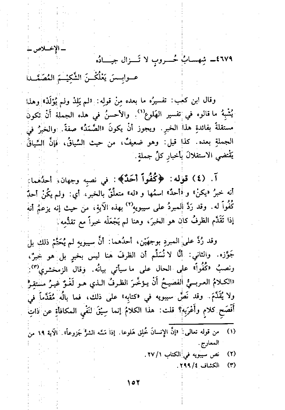 وقال ابن كعب: تفسيرُه ما بعده مِنْ قولِه: «لم يَلِدْ ولم يُوْلَدُ» وهذا يُشْبِهُ ما قالوه في تفسير الهَلوع. والأحسنُ في هذه الجملة أَنْ تكون مستقلةً بفائدةِ هذا الخبرِ. ويجوز أنْ يكونَ «الصَّمَدُ» صفةً. والخبرُ في الجملةِ بعده، كذا قيل: وهو ضعيفٌ، من حيث السِّياقُ، فإنَّ السِّياقَ يَقْتضي الاستقلالَ بأخبارِ كلِّ جملةٍ.