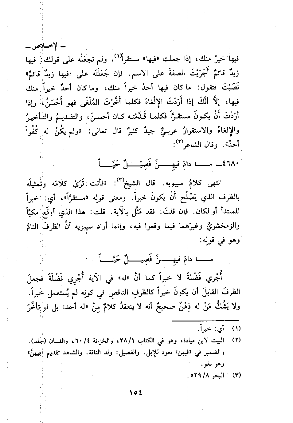 4680 - ما دامَ فيهِنَّ فَصِيْلٌ حَيَّاً ... انتهى كلامُ سيبويه. قال الشيخ: «فأنت ترى كلامَه وتمثيلَه بالظرف الذي يَصْلُح أَنْ يكونَ خبراً. ومعنى قولِه» مستقرَّاً «أي: خبراً للمبتدأ أو لكان. فإن قلتَ: فقد مَثَّل بالآية. قلت: هذا أوقَع مكيَّاً والزمخشريَّ وغيرَهما فيما وقعوا فيه، وإنما أراد سيبويه أنَّ الظرفَ التامَّ وهو في قولِه: