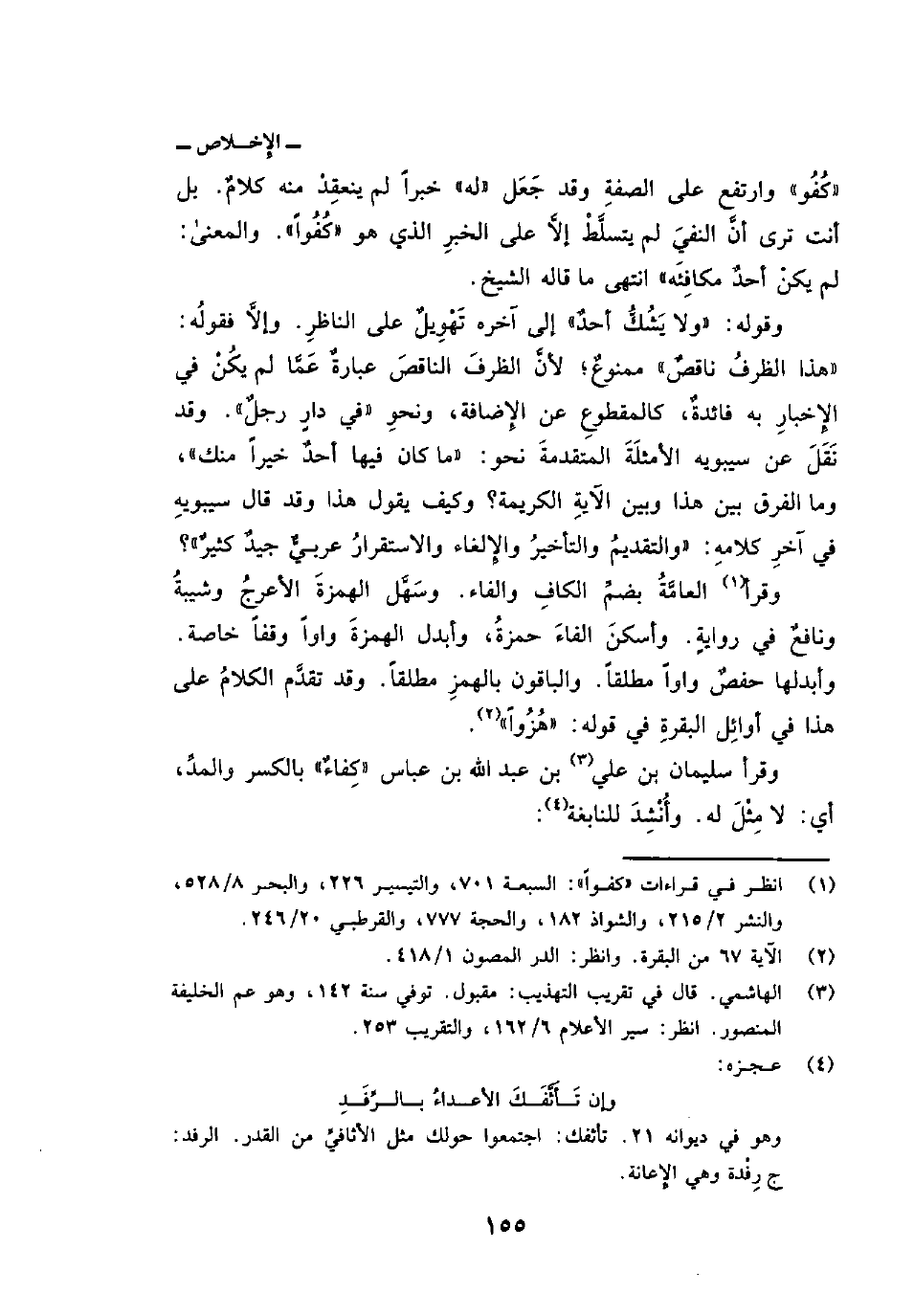 كُفُو «وارتفع على الصفةِ وقد جَعَل» له «خبراً لم ينعقِدْ منه كلامٌ. بل أنت ترى أنَّ النفيَ لم يتسلَّطْ إلاَّ على الخبرِ الذي هو» كُفُواً «والمعنى: لم يكنْ أحدٌ مكافِئَه» انتهى ما قاله الشيخ.