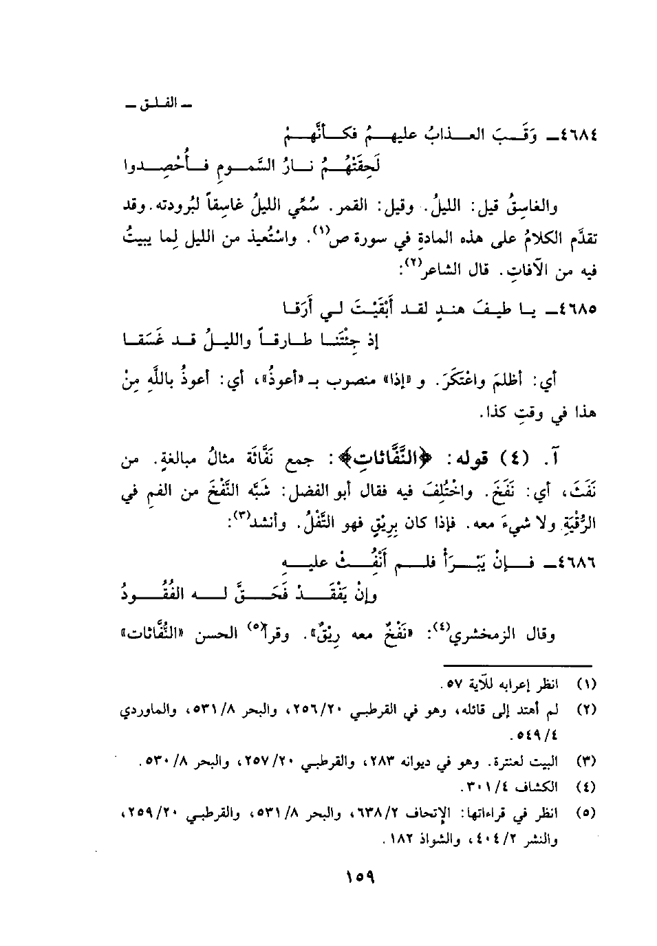 قوله: {النفاثات} : جمع نَفَّاثَة مثالُ مبالغةٍ. من نَفَثَ، أي: نَفَخَ. واخْتُلِفَ فيه فقال أبو الفضل: شَبَّه النَّفْخَ من الفمِ في الرُّقْيَةِ ولا شيءَ معه. فإذا كان بِرِيْقٍ فهو التَّفْلُ وأنشد: