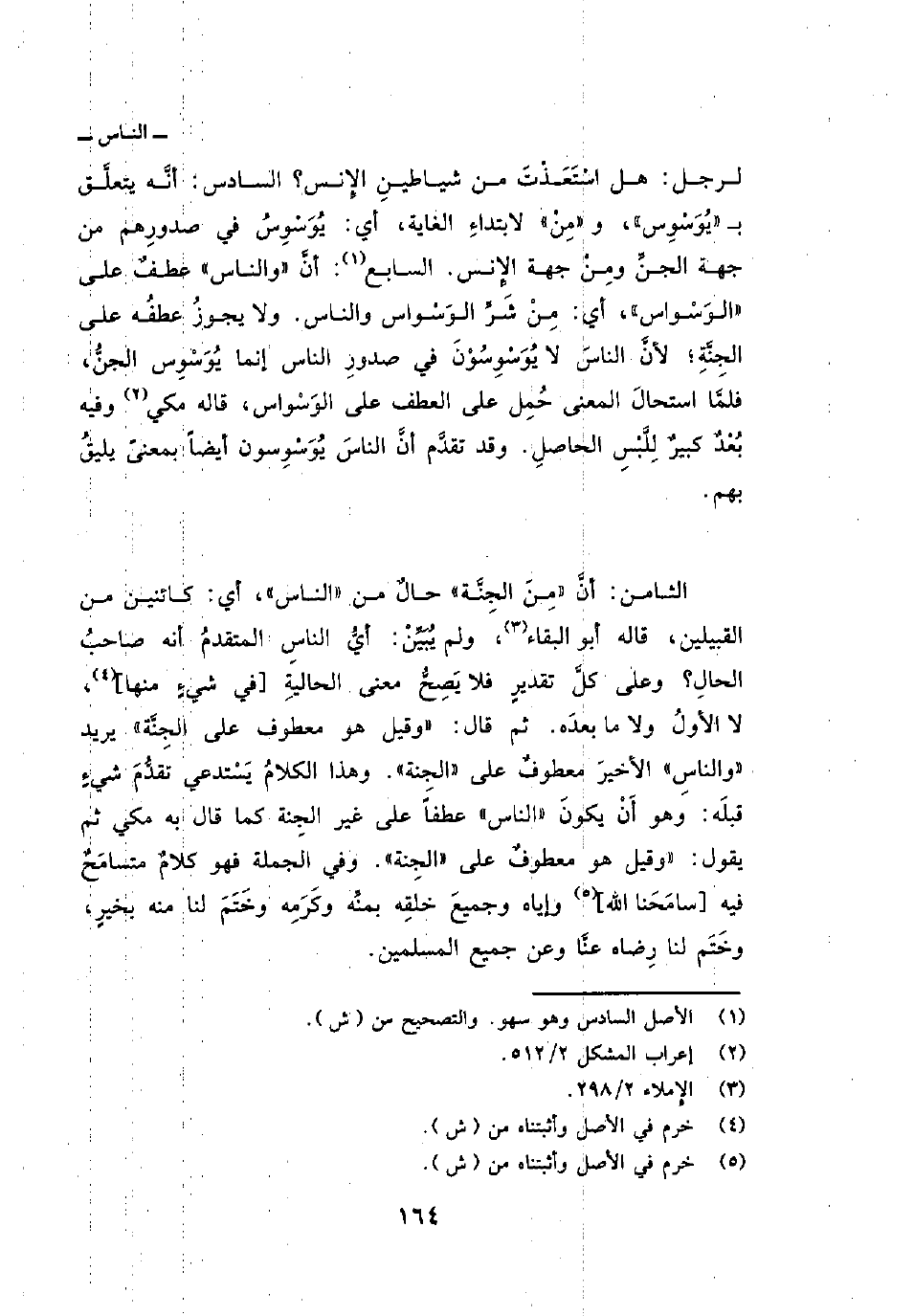 الثامن: أنَّ {مِنَ الجنة} حالٌ من «الناس» ، أي: كائنين من القبيلين، قاله أبو البقاء، ولم يُبَيِّنْ: أيُّ الناسِ المتقدمُ أنه صاحبُ الحالِ؟ وعلى كلِّ تقديرٍ فلا يَصِحُّ معنى الحاليةِ [في شيءٍ منها] ، لا الأولُ ولا ما بعدَه. ثم قال: «وقيل: هو معطوف على الجِنَّة» يريد «والناسِ» الأخيرَ معطوفٌ على «الجِنة» وهذا الكلامُ يَسْتدعي تقدُّمَ شيءٍ قبلَه: وهو أَنْ يكونَ «الناس» عطفاً على غير الجِنة كما قال به مكي ثم يقول: «وقيل هو معطوفٌ على» الجِنة «وفي الجملة فهو كلامٌ متسامَحٌ فيه [سامَحَنا الله] وإياه وجميعَ خلقِه بمنِّة وكَرَمِه وخَتَمَ لنا منه بخيرٍ، وخَتَم لنا رِضاه عنَّا وعن جميع المسلمين.