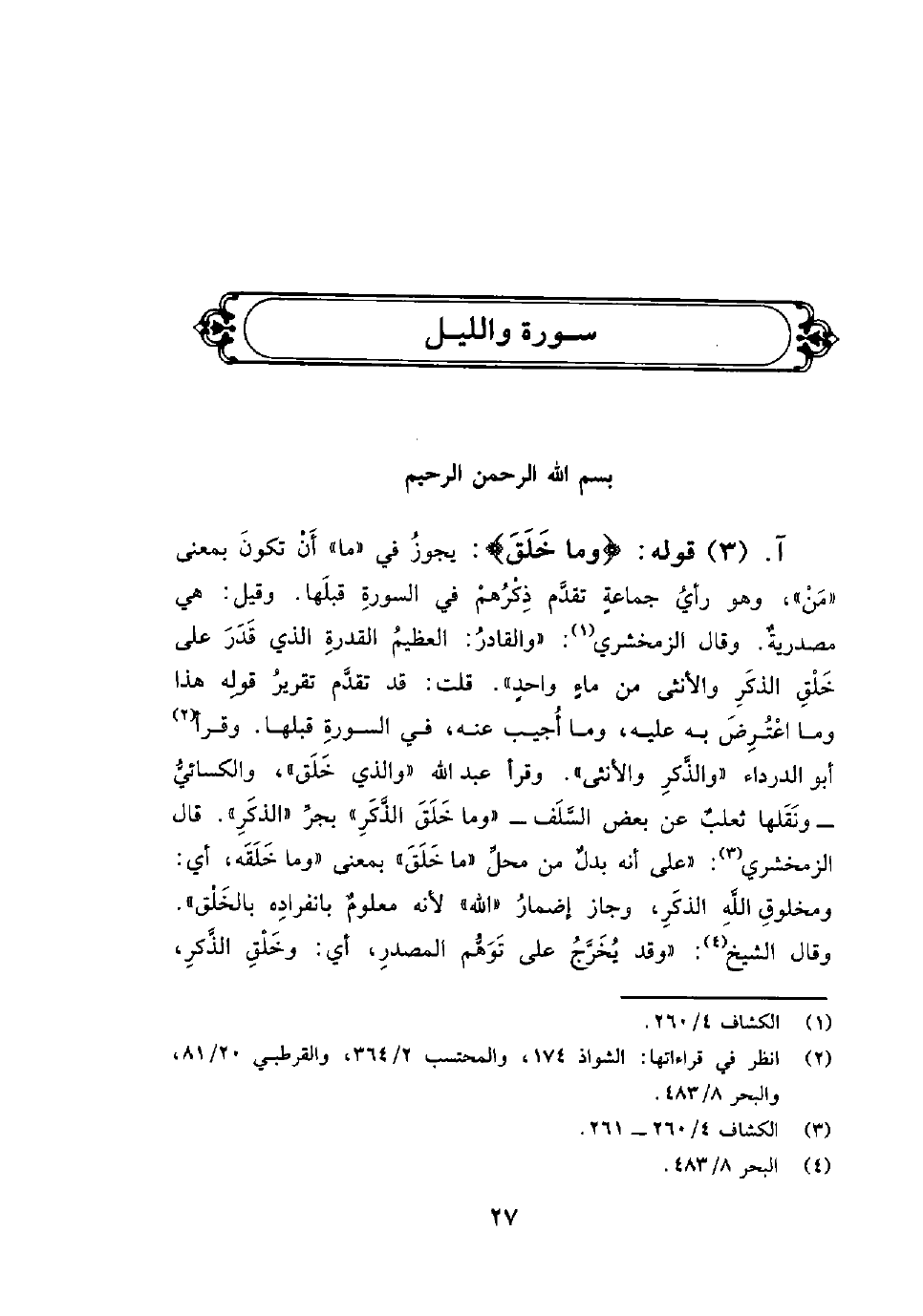 قوله: {وَمَا خَلَقَ} : يجوزُ في «ما» أَنْ تكونَ بمعنى «مَنْ» وهو رأيُ جماعةٍ تقدَّم ذِكْرُهمْ في السورةِ قبلَها. وقيل: هي مصدريةٌ. وقال الزمخشري: «والقادرُ: العظيمُ القدرةِ الذي قَدَرَ على خَلْقِ الذكَرِ والأنثى من ماءٍ واحدٍ» قلت: قد تقدَّم تقريرُ قولِه هذا وما اعْتُرِضَ به عليه، وما أُجيب عنه، في السورةِ قبلها. وقرأ أبو الدرداء «والذَّكرِ والأنثى» وقرأ عبد الله «والذي خَلَق» ، والكسائيُّ ونَقَلها ثعلبٌ عن بعض السَّلَف «وما خَلَقَ الذَّكَرِ» بجرِّ «الذكَرِ» قال الزمخشري: «على أنه بدلٌ من محلِّ» ما خَلَقَ «بمعنى» وما خَلَقَه «أي: ومخلوقِ اللَّهِ الذكَرِ، وجاز إضمارُ» الله «لأنه معلومٌ بانفرادِه بالخَلْق» . وقال الشيخ: «وقد يُخَرَّجُ على تَوَهُّم المصدرِ، أي: وخَلْقِ الذَّكرِ،