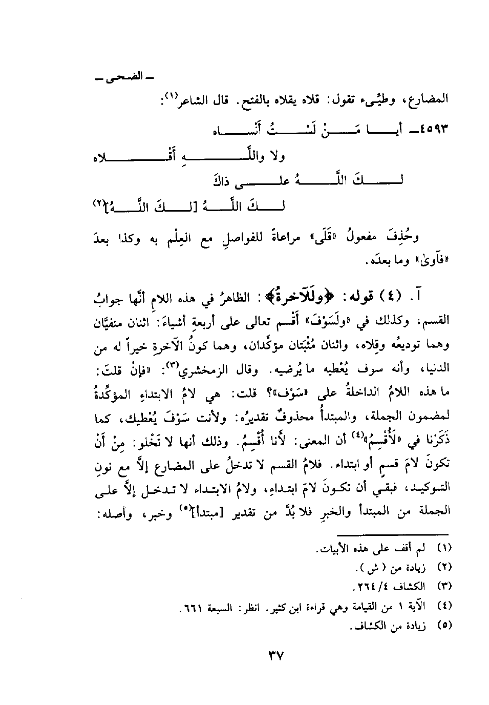 قوله: {وَلَلآخِرَةُ} : الظاهرُ في هذه اللامِ أنَّها جوابُ القسم، وكذلك في «ولَسَوْفَ» أَقْسم تعالى على أربعةِ أشياءَ: اثنان منفيَّان وهما توديعُه وقِلاه، واثنان مُثْبَتان مؤكَّدان، وهما كونُ الآخرةِ خيراً له من الدنيا، وأنه سوف يُعْطيه ما يُرضيه. وقال الزمخشري: «فإنْ قلتَ: ما هذه اللامُ الداخلةُ على» سَوْف «؟ قلت: هي لامُ الابتداءِ المؤكِّدةُ لمضمون الجملة، والمبتدأُ محذوفٌ تقديرُه: ولأنت سَوْفَ يُعْطيك، كما ذَكَرْنا في {لاَ أُقْسِمُ} [القيامة: 1] أن المعنى: لأَنا أُقْسِمُ. وذلك أنها لا تَخْلو: مِنْ أَنْ تكونَ لامَ قسمٍ أو ابتداء. فلامُ القسم لا تدخلُ على المضارع إلاَّ مع نونِ التوكيد، فبقي أن تكونَ لامَ ابتداءِ، ولامُ الابتداء لا تدخل إلاَّ على الجملة من المبتدأ والخبرِ فلا بُدَّ من تقدير [مبتدأ] وخبره، وأصله: