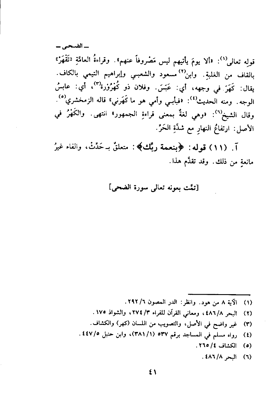 قولِه تعالى: {أَلاَ يَوْمَ يَأْتِيهِمْ لَيْسَ مَصْرُوفاً عَنْهُمْ} [هود: 8] . وقراءةُ العامَّةِ «تَقْهَرْ» بالقاف من الغلبةِ. وابن مسعود والشعبي وإبراهيم التيمي بالكاف. يقال: كَهَرَ في وجهه، أي: عَبَسَ. وفلان ذو كُهْرُوْرة، أي عابسُ الوجه. ومنه الحديث «فبأبي وأمي هو ما كَهَرني» قاله الزمخشري. وقال الشيخ: «وهي لغةٌ بمعنى قراءةِ الجمهور» انتهى. والكَهْرُ في الأصل: ارتفاعُ النهارِ مع شدَّةِ الحَرِّ