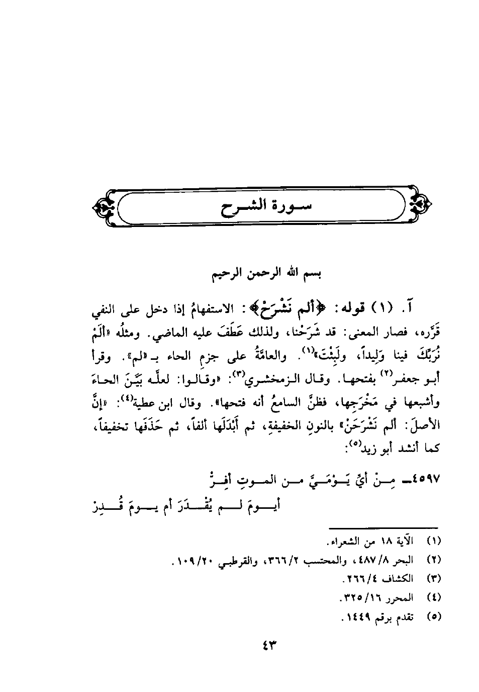 قوله: {أَلَمْ نَشْرَحْ} : الاستفهامُ إذا دخل على النفي قَرَّره، فصار المعنى: قد شَرَحْنا، ولذلك عَطَفَ عليه الماضي. ومثلُه {أَلَمْ نُرَبِّكَ فِينَا وَلِيداً وَلَبِثْتَ} [الشعراء: 18] . والعامَّةُ على جزمِ الحاء ب «لم» وقرأ أبو جعفر بفتحها. وقال الزمخشري: «وقالوا: لعلَّة بَيَّنَ الحاءَ وأشبعها في مَخْرَجِها، فظنَّ السامعُ أنه فتحها» وقال ابن عطية: «إنَّ الأصلَ: ألم نَشْرَحَنْ» بالنونِ الخفيفةِ، ثم أَبْدَلَها ألفاً، ثم حَذَفَها تخفيفاً، كما أنشد ابو زيد: