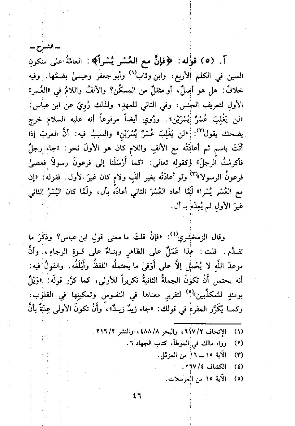 قوله: {فَإِنَّ مَعَ العسر يُسْراً} : العامَّةُ على سكونِ السين في الكلم الأربع، وابن وثاب وأبو جعفر وعيسى بضمِّها. وفيه خلافٌ. هل هو أصلٌ، أو مثقلٌ من المسكِّن؟ والألفُ واللامُ في «العُسر» الأولِ لتعريف الجنس، وفي الثاني للعهدِ؛ ولذلك رُوِيَ عن ابن عباس: «لن يُغْلِبَ عُسْرٌ يُسْرَيْن» ورُوي أيضاً مرفوعاً أنه عليه السلام خرج يضحك يقول: «لن يَغْلِبَ عُسْرٌ يُسْرَيْنِ» والسببُ فيه: أنَّ العربَ إذا أَتَتْ باسمٍ ثم أعادَتْه مع الألفِ واللامِ ِكان هو الأولَ نحو: «جاء رجلٌ فأكرمْتُ الرجلَ» وكقولِه تعالى: {كَمَآ أَرْسَلْنَآ إلى فِرْعَوْنَ رَسُولاً فعصى فِرْعَوْنُ الرسول} [المزمل: 1516] ولو أعادَتْه بغير ألفٍ ولامٍ كان غيرَ الأول. فقوله: {إِنَّ مَعَ العسر يُسْراً} لَمَّا أعاد العُسْرَ الثاني أعادَه بأل، ولَمَّا كان اليُسْرُ الثاني غيرَ الأولِ لم يُعِدْه ب أل.